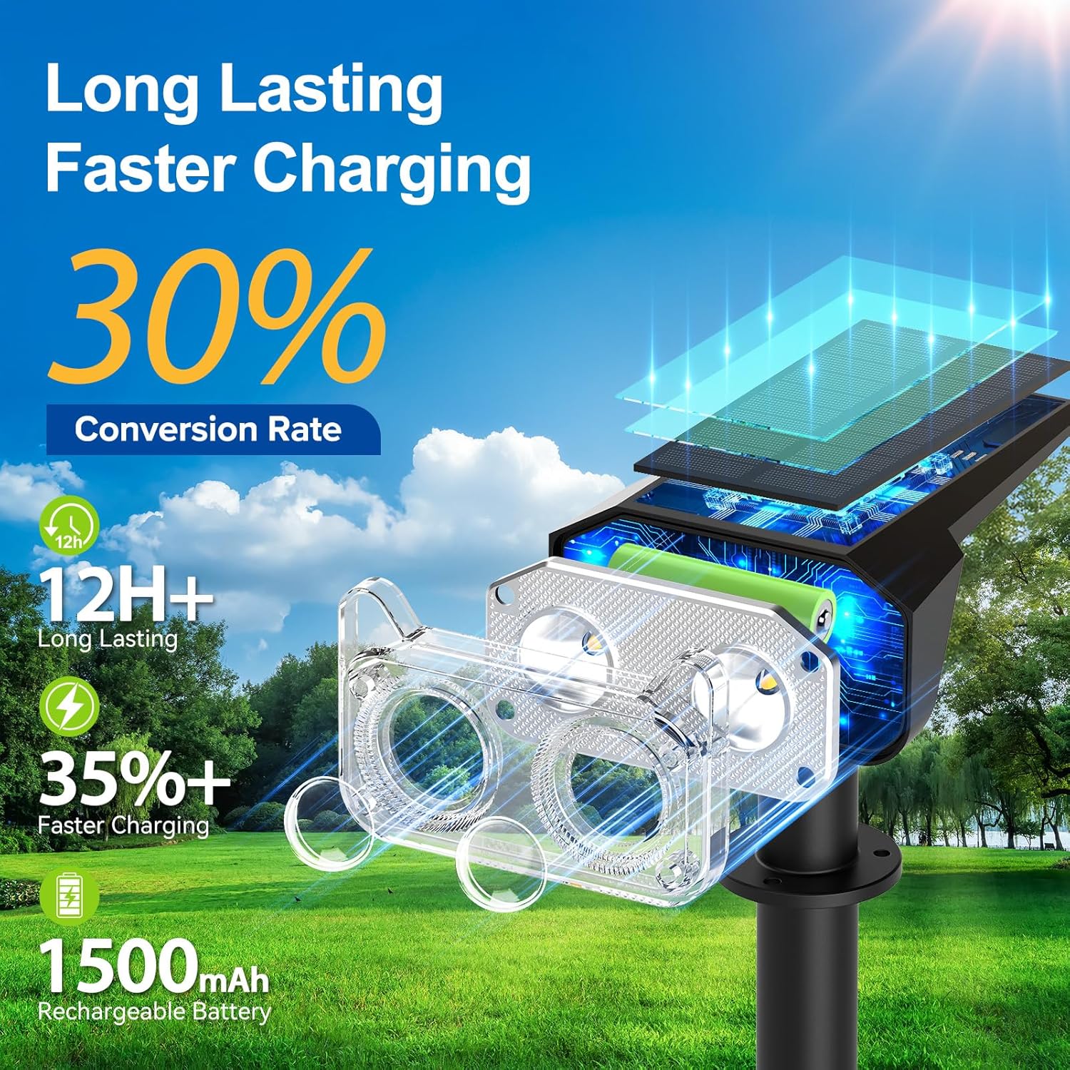 - High Efficiency & Auto ON/OFF: Solar spotlights outdoor equipped with advanced laminated solar panel, which are higher qualitity and less likely to discolor or degrade compared to regular solar panel. With an upgraded conversion rate of up to 30%, solar powered spot lights outdoor offer superior charging efficiency. Simply turn on the switch, and the solar lights outdoor will auto charge during the day and light up at night.Enjoy hands-free lighting with spot lights outdoor every day