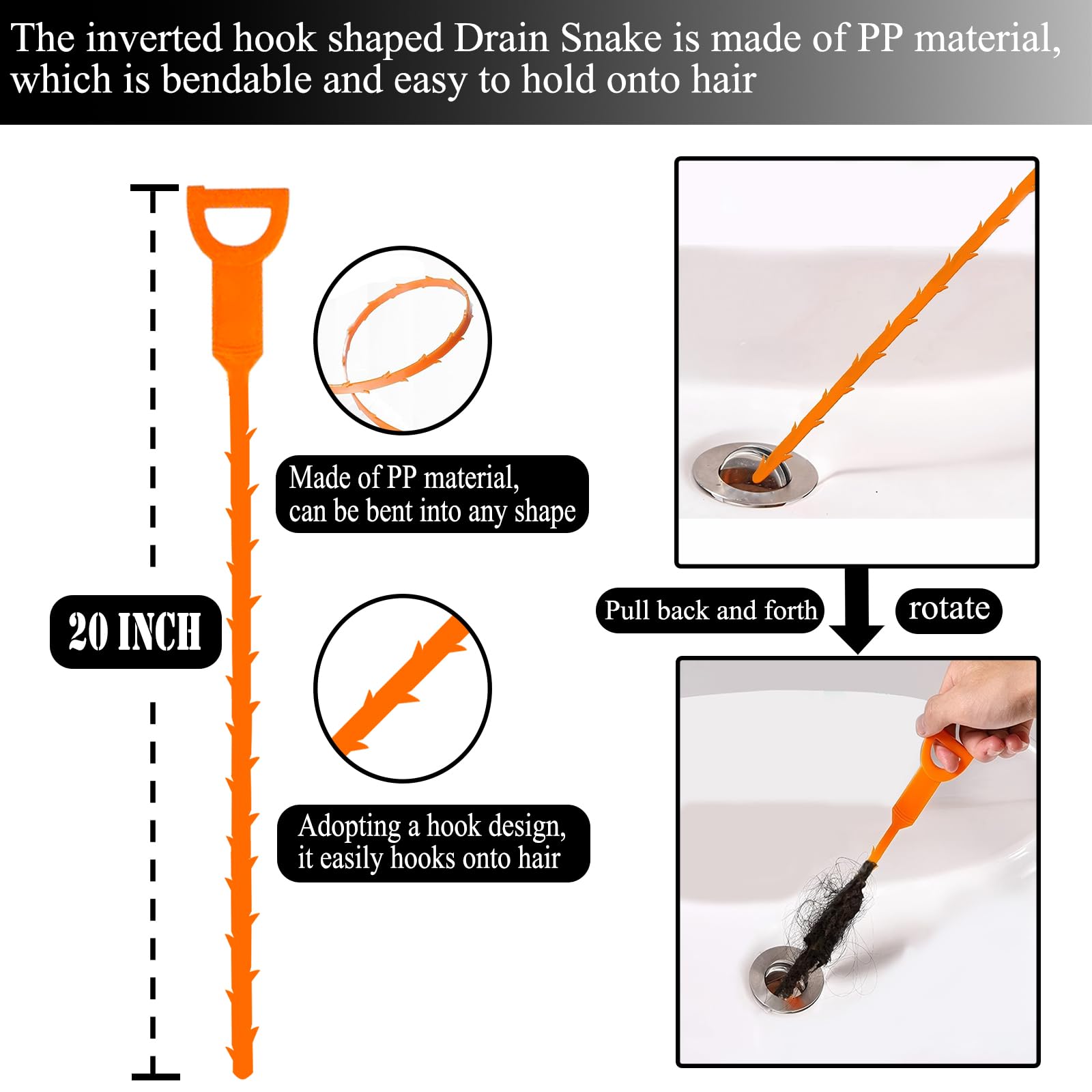 - 【Flexible & Bendable】: Soft enough to bend into various filters and pipes, drain snake can easily grab and remove accumulated hair, food, garbage, and other obstacles/debris.