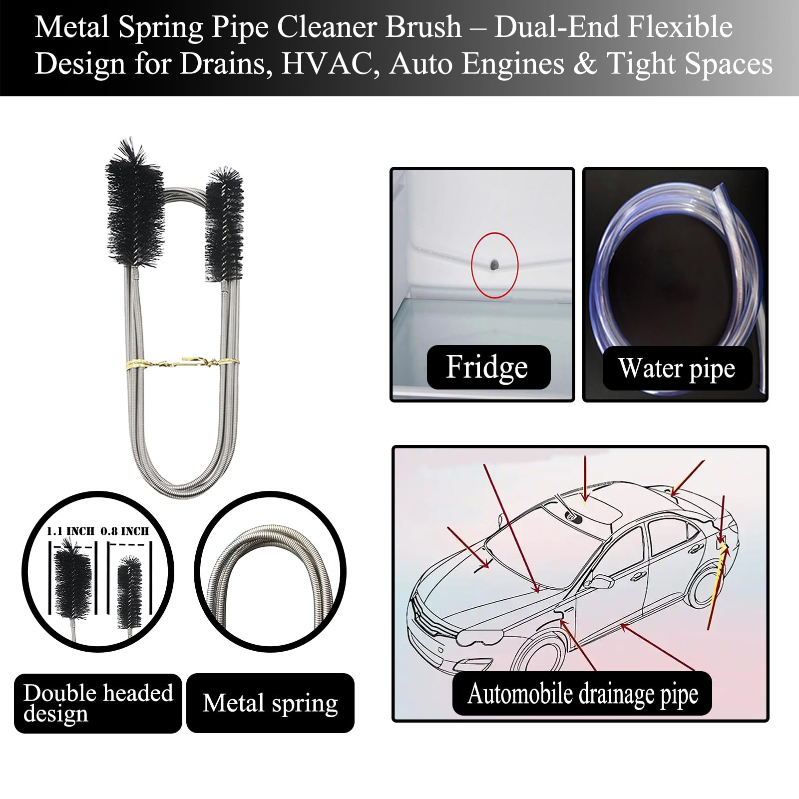 - 【UPGRADED EXTRA LONG】Metal clog remover is 63 inches long with a claw extending from the top, which could easily insert to deeper pipes, and grab the blockage and hair. Drain snake is 20 inches long with tiny hooked teeth on it, which is perfect to insert and easy to pull out hair and blockage. The brush is bendable and the spring unclogger is flexible, durable and suitable for daily cleaning of the inside of the pipe.