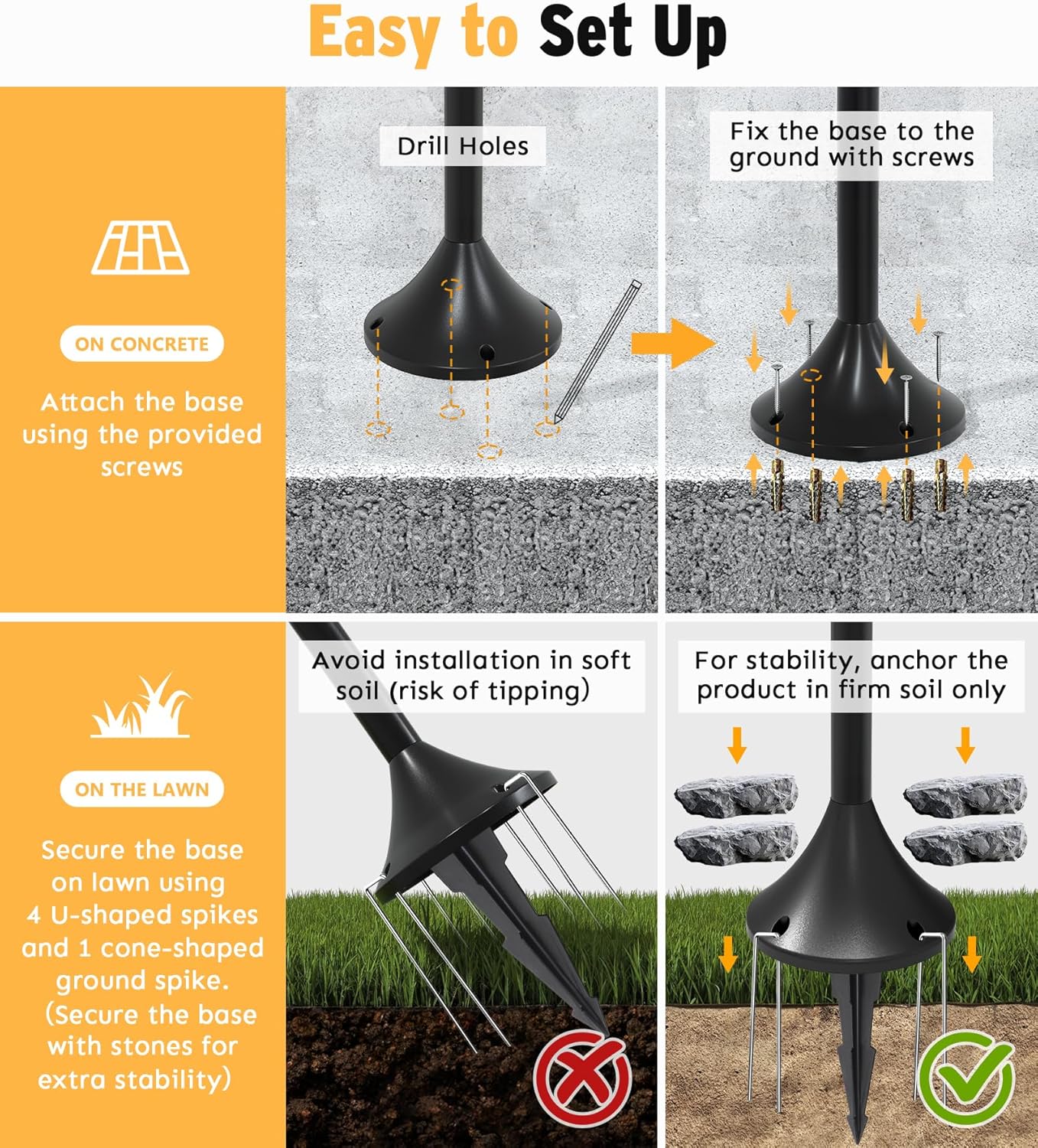 - 【Easy Installation】These solar lamp posts are completely wire-free. For concrete floors, simply secure the base using the included screws. For lawns, use the provided ground stakes or U-shaped metal tubes. Adjust the height by removing or reattaching the connecting rods.(For optimal durability and stability when installing on grass, please choose a spot with firm soil. Soft or loose ground may cause the product to wobble slightly over time)