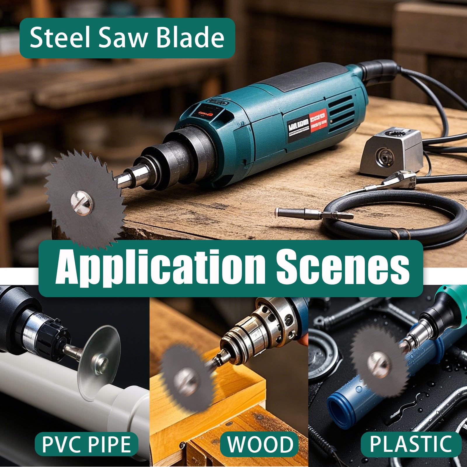 - 6Pcs HSS circular saw blades: Cut off saw blades are high speed steel and there are 6 kinds of outer diameters 22/25/32/35/44/50mm, and comes with 1Pcs 3.2mm shank 1Pcs 6mm shank. They are suitable for cutting plastic products, wood, aluminum alloy, soft metal, etc.