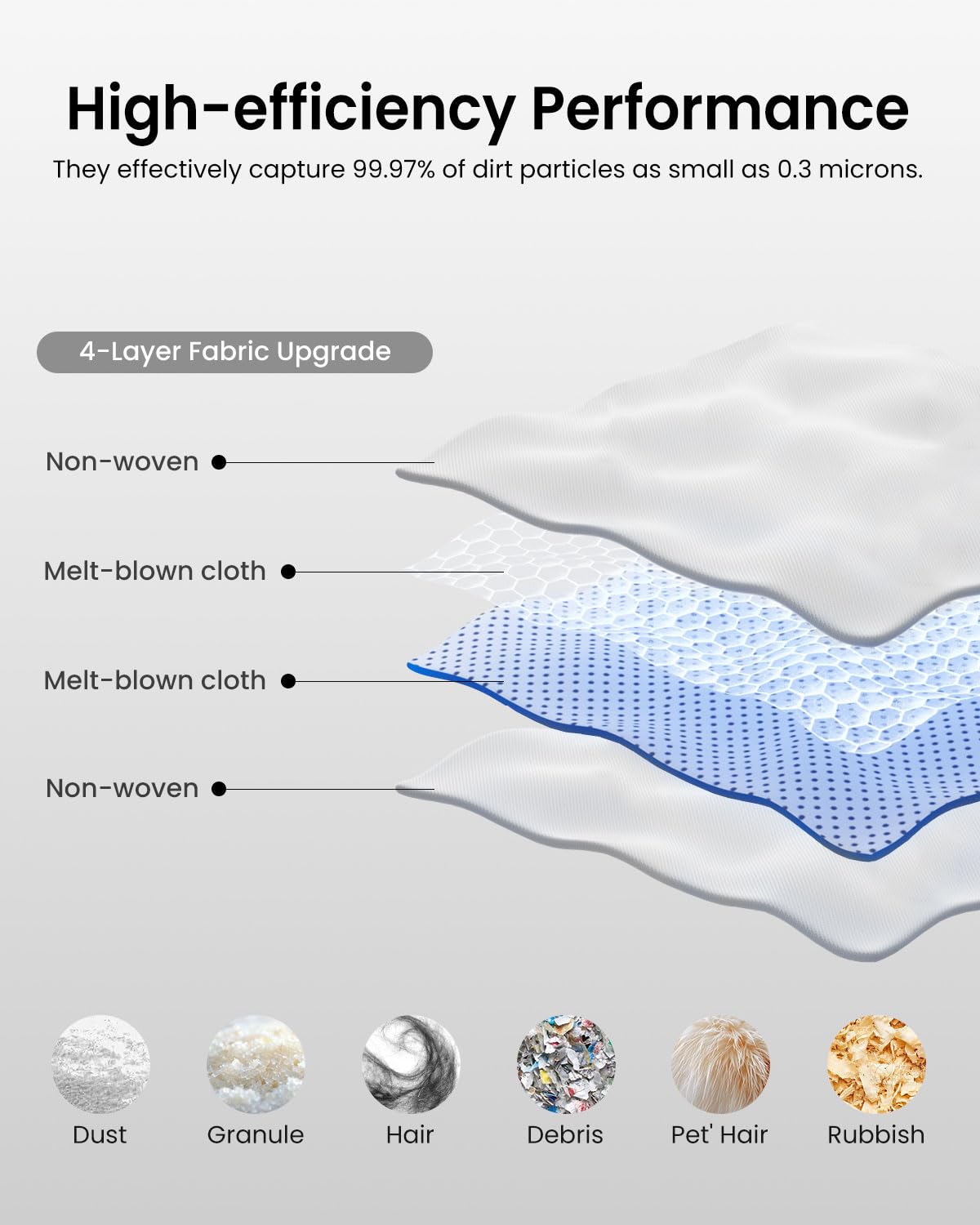 - 【Efficient Performance】: Rrochio vacuum dust bag is made of 2 layers of melt-blown fabric, 2 layers of non-woven fabric, which can effectively filter 99.9% of fine dust and particles, reducing the amount of dust in the space, especially suitable for people who don't like to come into contact with dust.