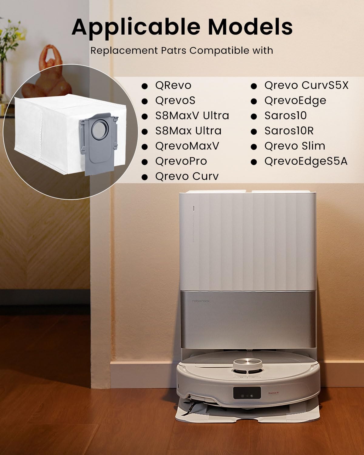- 【Applicable Machines】: Rrochio Replacement Dust Bag compatible with Roborock Saros 10, Saros 10R, Q Revo, Qrevo S, S8 MaxV Ultra, S8 Max Ultra, Qrevo MaxV, Qrevo Pro, Qrevo Slim, Qrevo Curv, Qrevo CurvX, Qrevo Curv S5X, Qrevo Edge, Qrevo Edge S5A, QV 35A, Qrevo S5V Clean Base Automatic Dirt Disposal models. Ensure to check the model of your vacuum cleaner before making a purchase.