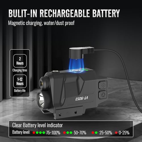- ¡¼High Bright Flashlight¡½The 700 Lumens tactical flashlight and laser combo is rechargeable, can run about 12 hours for laser only, 75 minutes for flashlight only, 60 minutes for flashlight and laser.The laser output is less than 5mW, class IIIa. The laser beam distance is about 200 meters/ day; 2000 meters/ night.