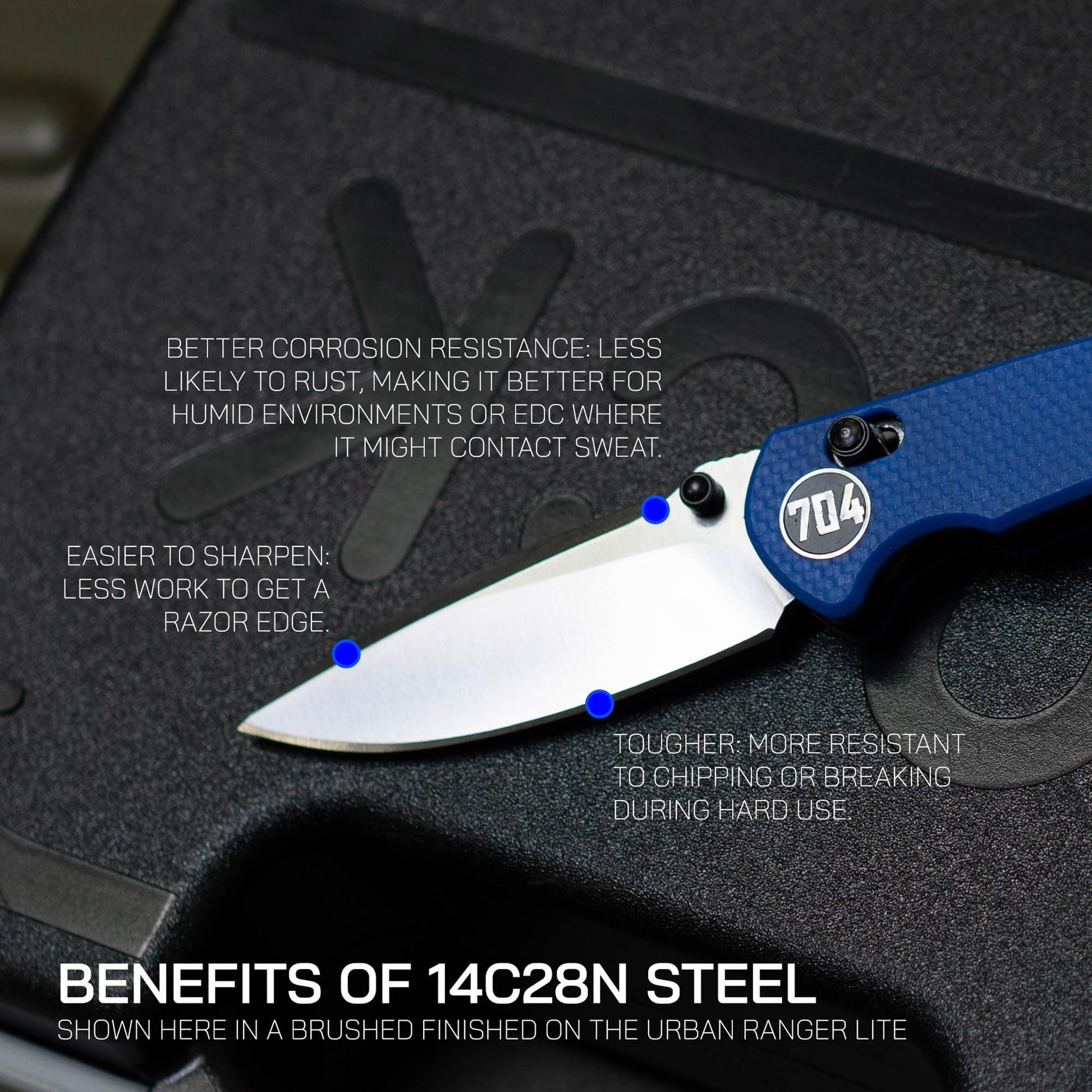 - The Urban Ranger series pocket knife from 704 Gear is a versatile pocket knife perfect for everyday carry - vetted and approved by 704 Tactical! V2 comes with the same drop point blade profile and ergonomic handle design, but with a crossbar lock deployment mechanism, a 14C28N steel blade, and new color options.