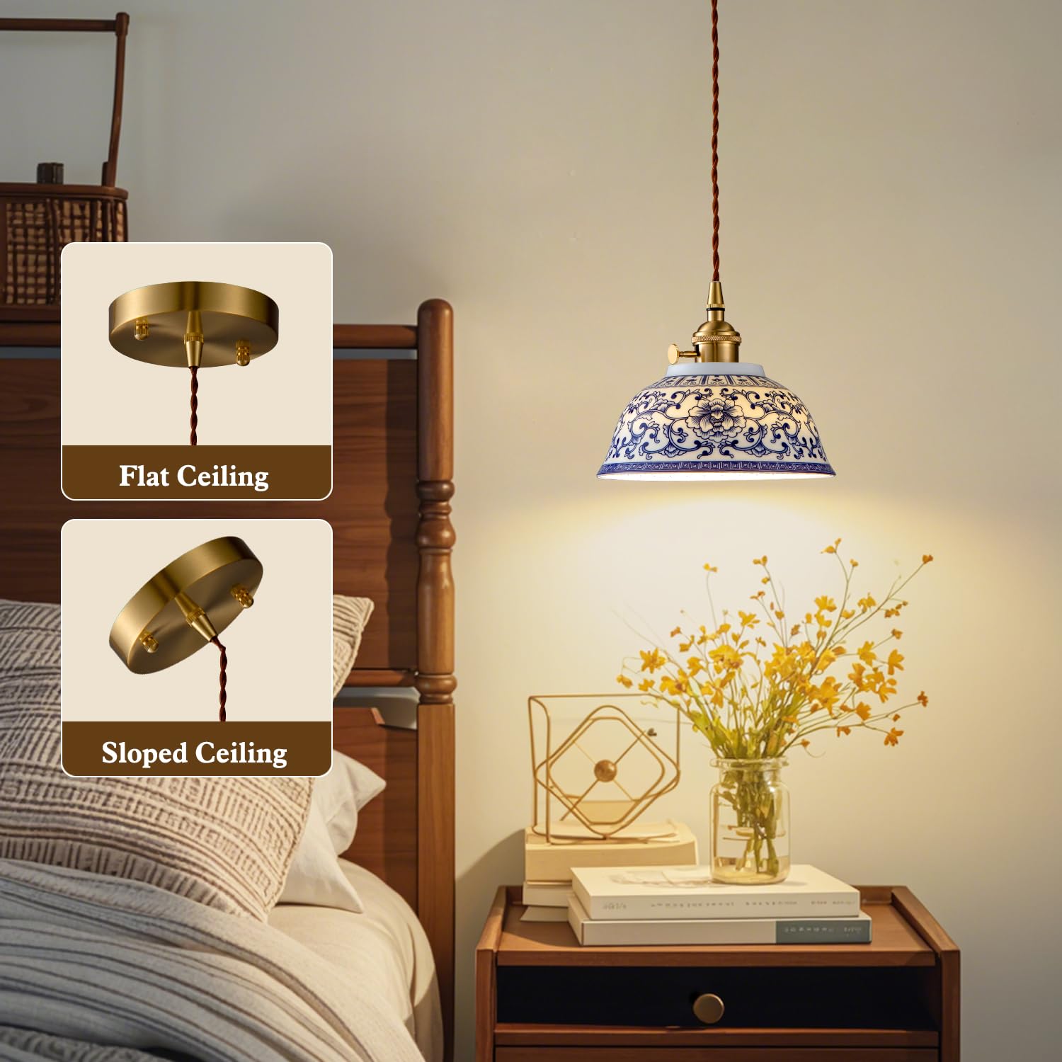 - 【Product Advantages】 The lampshade of the Pendant light fixture is made of ceramic material. The blue and white porcelain has a fine texture and rich colors. The hanging pendant light base and cover are made of high-quality brass material, creating a warm lighting atmosphere.