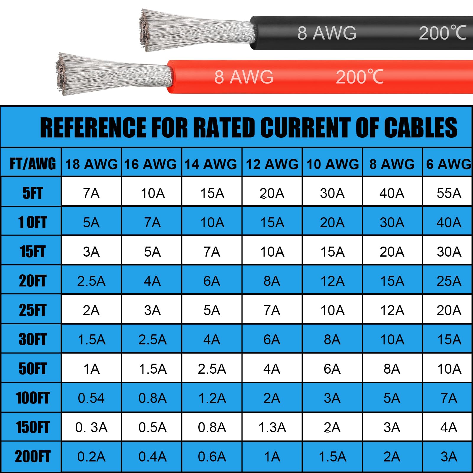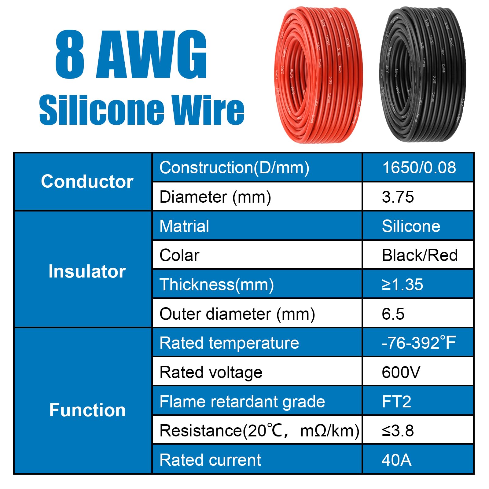 - Heavy Duty 8 Gauge Silicone Copper Wire: Made of 1650 strands of 0.08mm tinned copper and silicone jacket that makes it flexible. Flame retardant grade FT2, Max voltage up to 600V. It effectively withstand high temperatures, enhancing safety and durability.