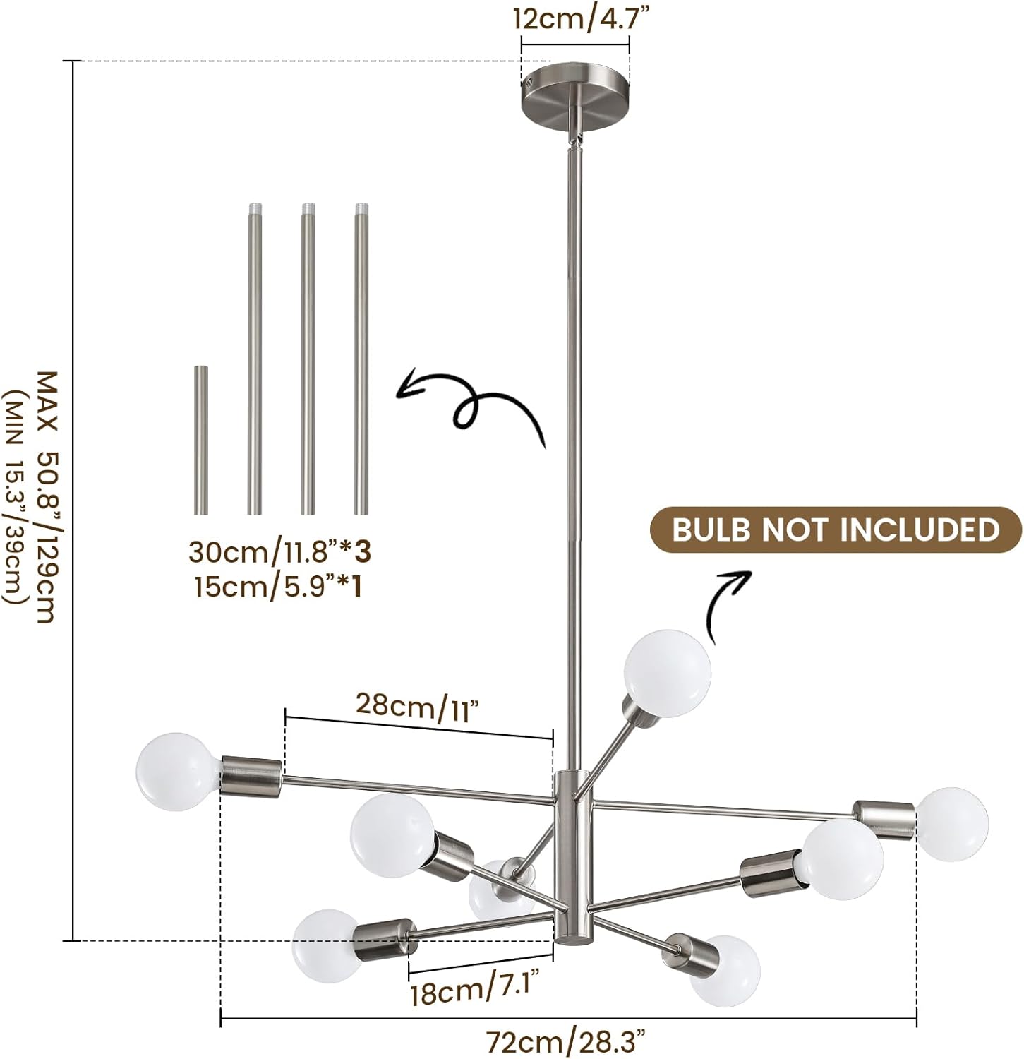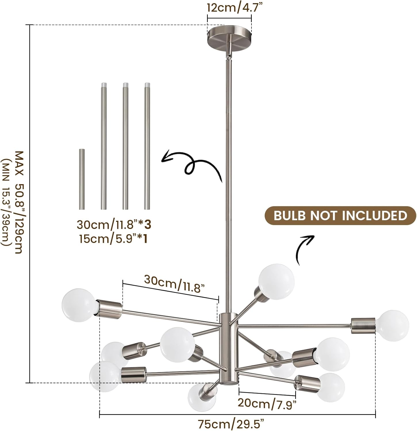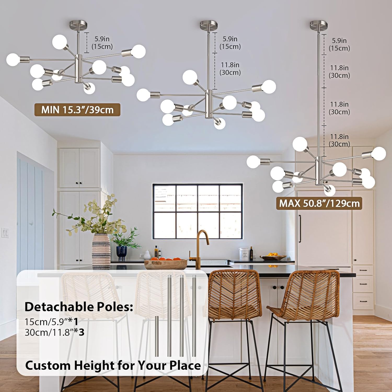 - Height Adjustable - Our modern chandelier has 4 extension rods (including 3×11.8-inch and 1×5.9-inch rod), the whole chandelier height is from minimum 15.3 inches/39 cm to maximum 50.8 inches/129 cm, with a wider adjustment range, allowing you to freely adjust the hanging height to meet your needs.