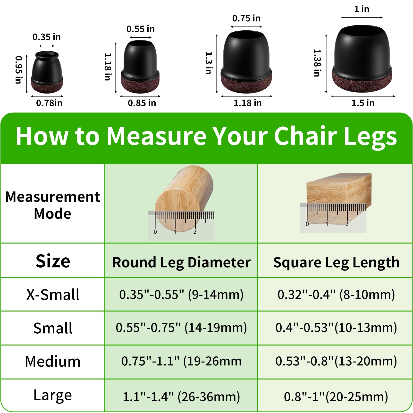 - 【APPLICABLE SIZES AND SHAPES】Our felt chair leg floor protectors have 3 shapes(square, round, rectangular), 5 sizes(XS, S, M, L, XL), and 2 colors(clear and black). You can choose according to your needs. Please measure the size of the furniture legs before purchasing to ensure a proper fit, snug is better than loose. This chair leg floor protectors small fit for round furniture leg with a diameter of 0.35"-0.55".