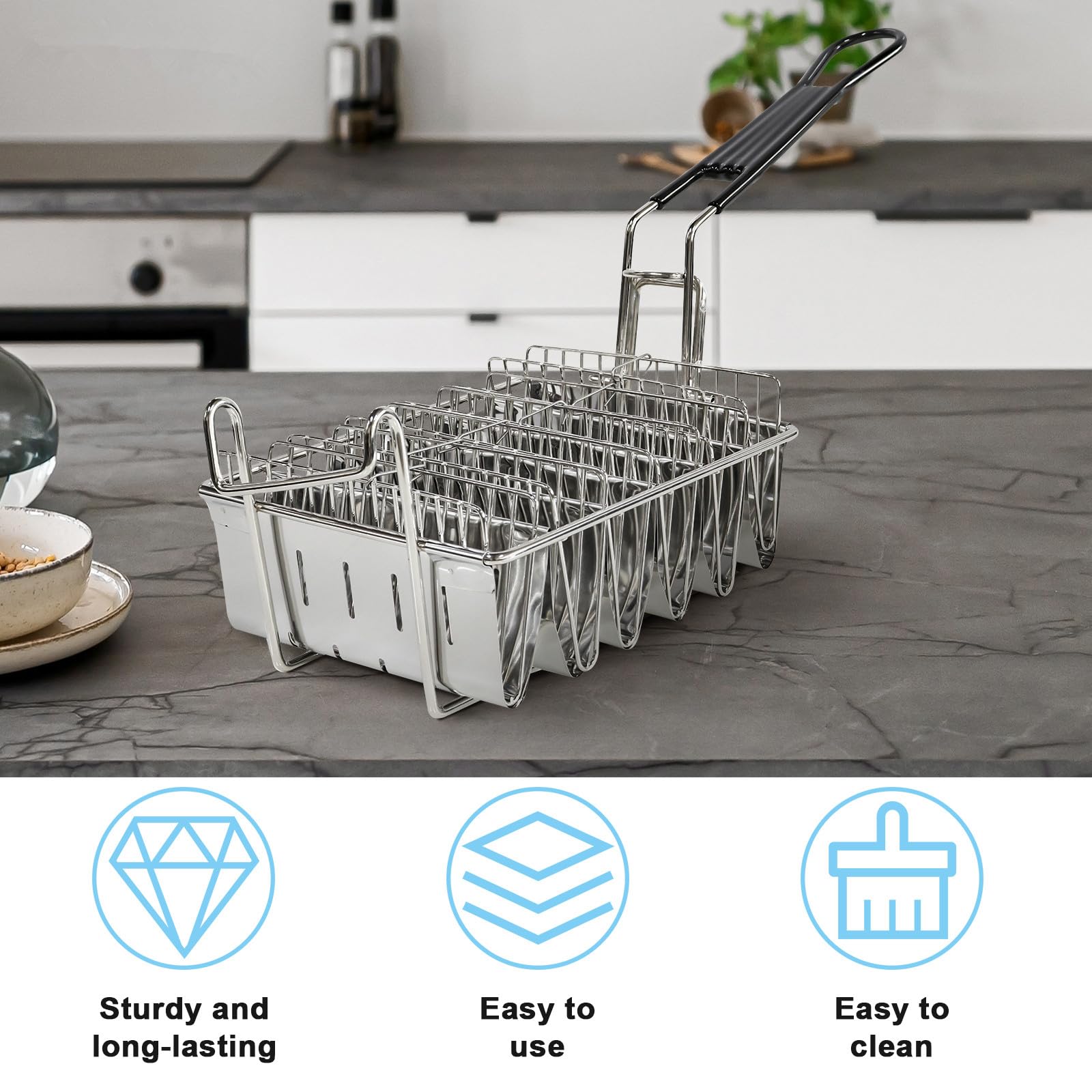 - Multi-Purpose Basket: Ideal for frying, serving, and draining taco shells, french fries, chicken wings, and other crispy snacks or appetizers.