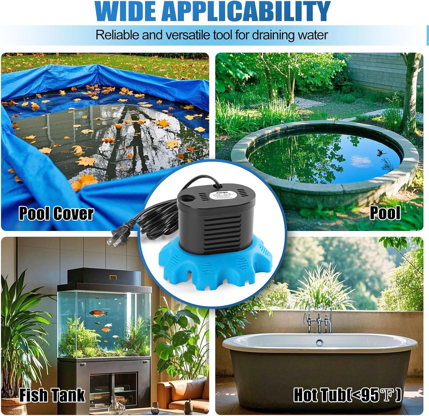 - POWERFUL POOL COVER PUMP: Pool sump pump can discharge water up to a max height of 10.5’ and a max speed of 850 GPH, which can easily and efficiently remove water from pool covers and suitable for removing water from fish tanks, aquariums, hot tubs, sumps