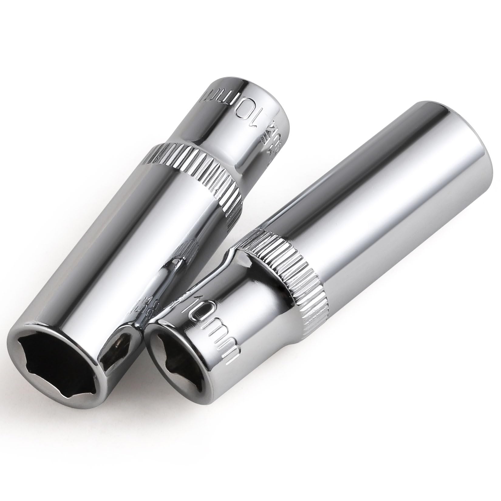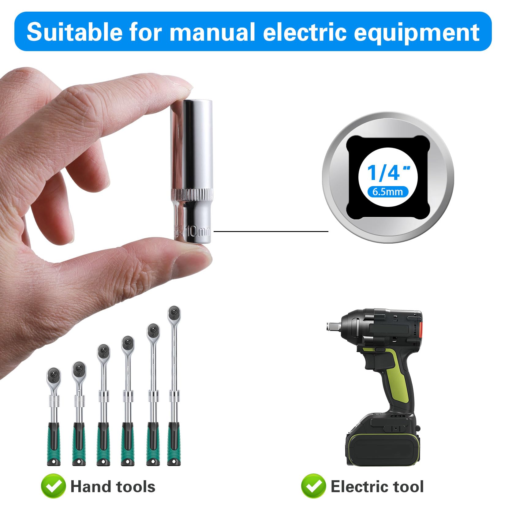 Details: 【Set Includes】 9 pieces of 6 points 10mm deep sockets with 1/4-inch drive, compatible with standard ratchets and tools.