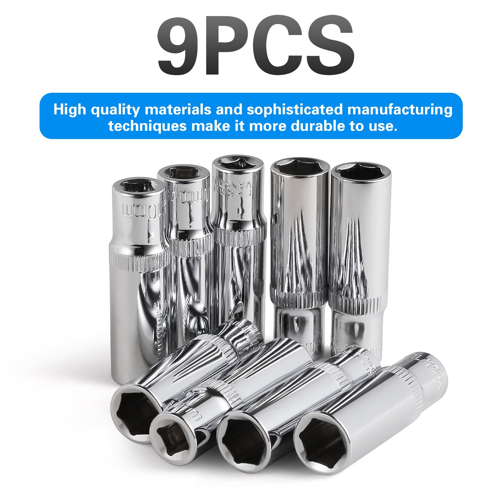 9-Piece 10mm Deep Sockets, 1/4-Inch Drive, 6-Point, Corrosion Resistance, Compatible with Standard Ratchet Wrenches and Tools