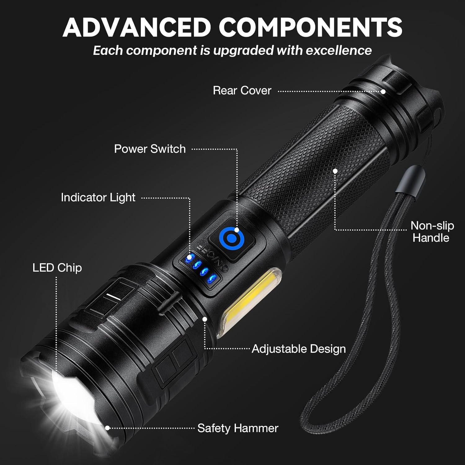 - Multi-Mode Flashlight - 7 lighting modes for different needs. This flash light high lumens has 3 main lighting modes (high, medium, strobe) and 4 side light modes (high, medium, strobe).