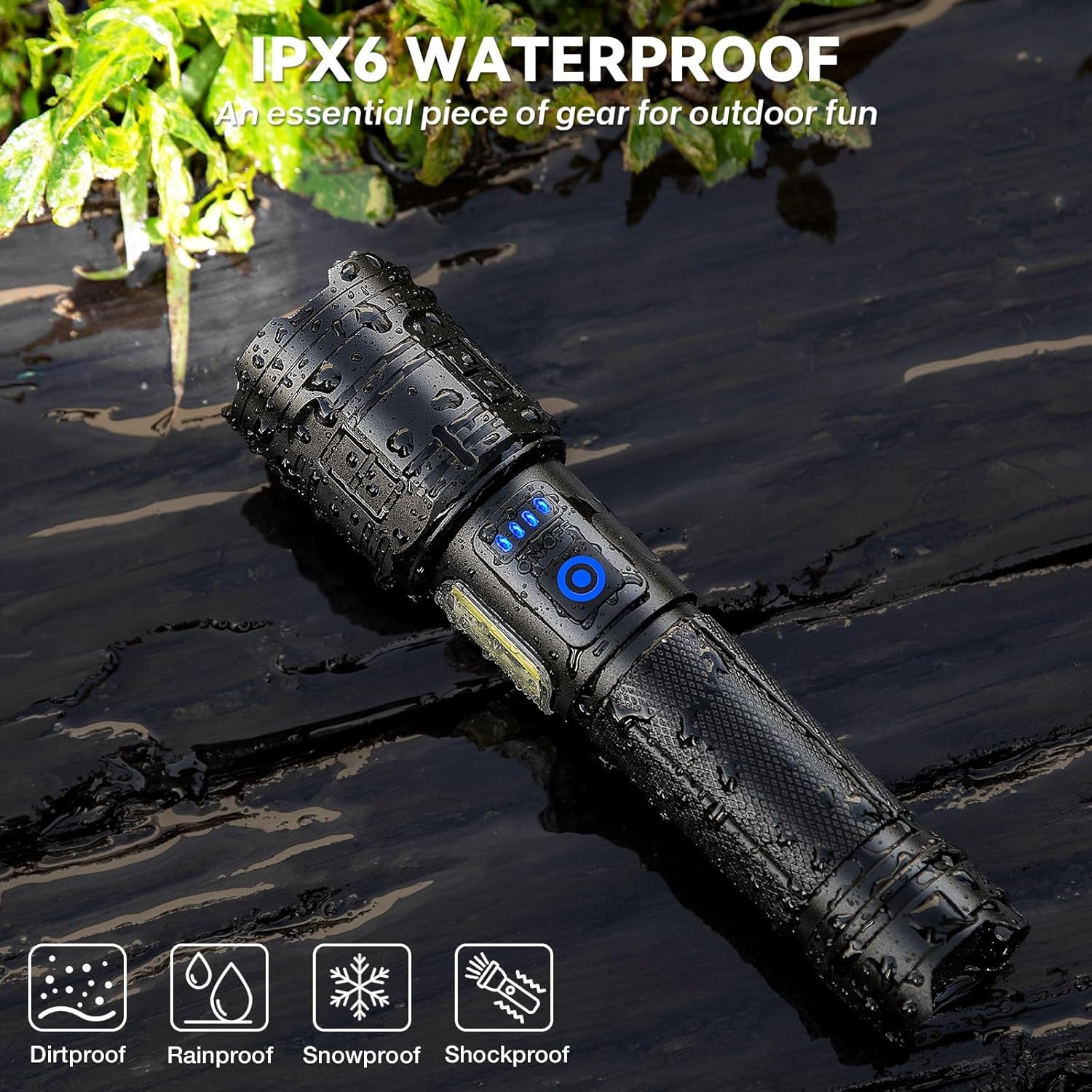 - IPX7 Waterproof - Reinforced waterproof construction. Can be used in emergency during hurricane season or power outages. NOTE: Do not immerse this bright flashlights high lumens directly into water or discard the dust cover of the charging port.