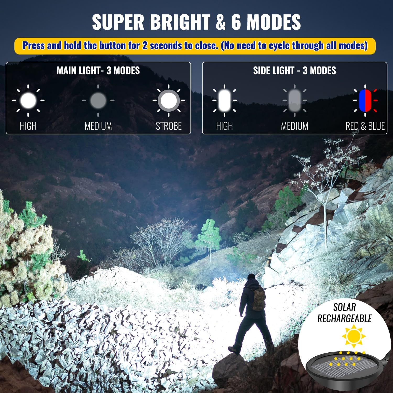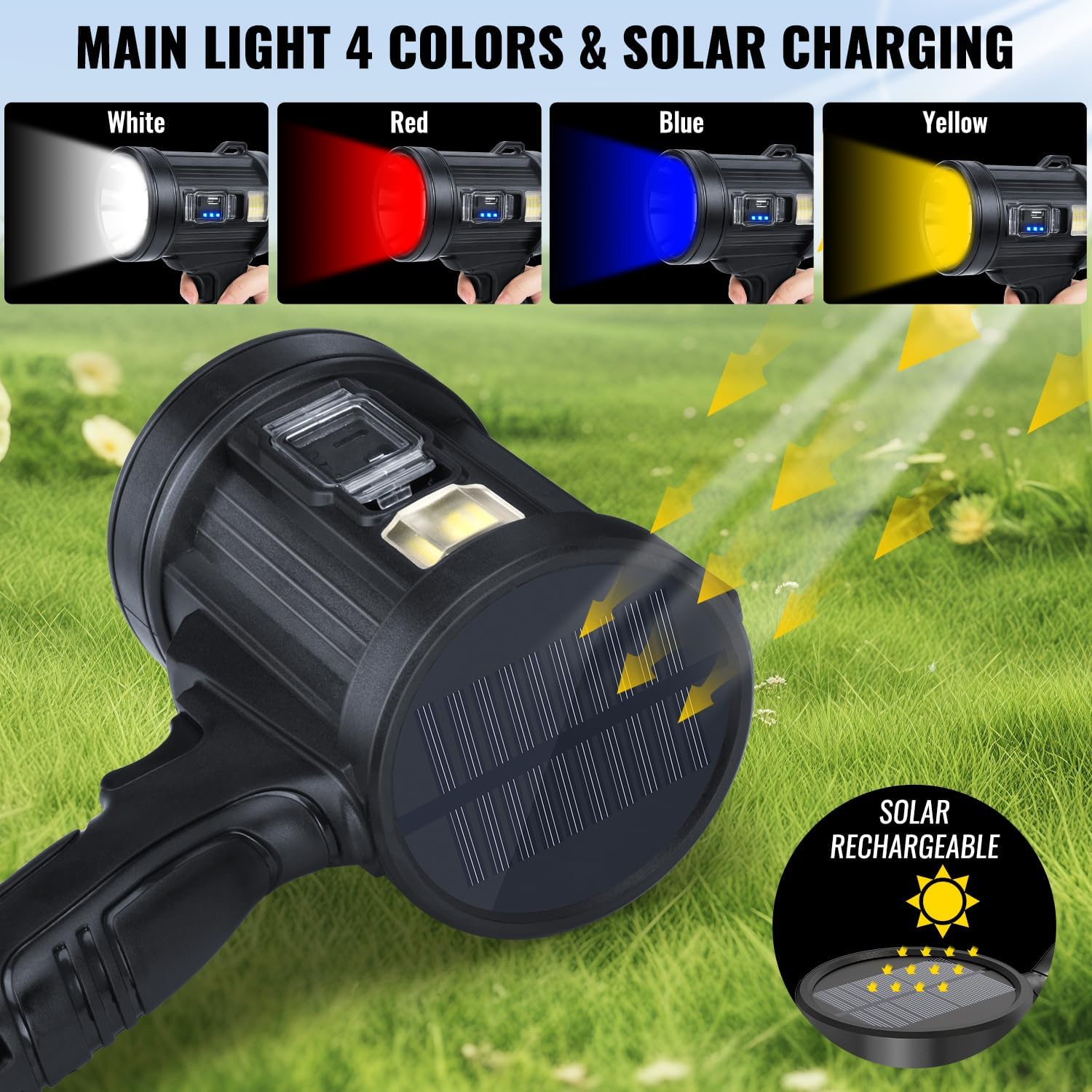 - SUPER BRIGHT SPOTLIGHT FLASHLIGHT - Large capacity, long running time.Sigoobal bright rechargeable spotlight can adjust 4 colors of light and has USB output and input functions. The best design is that it can be charged through solar energy. The spot light also has IPX5 waterproof, suitable for outdoor activities such as boating and hunting.