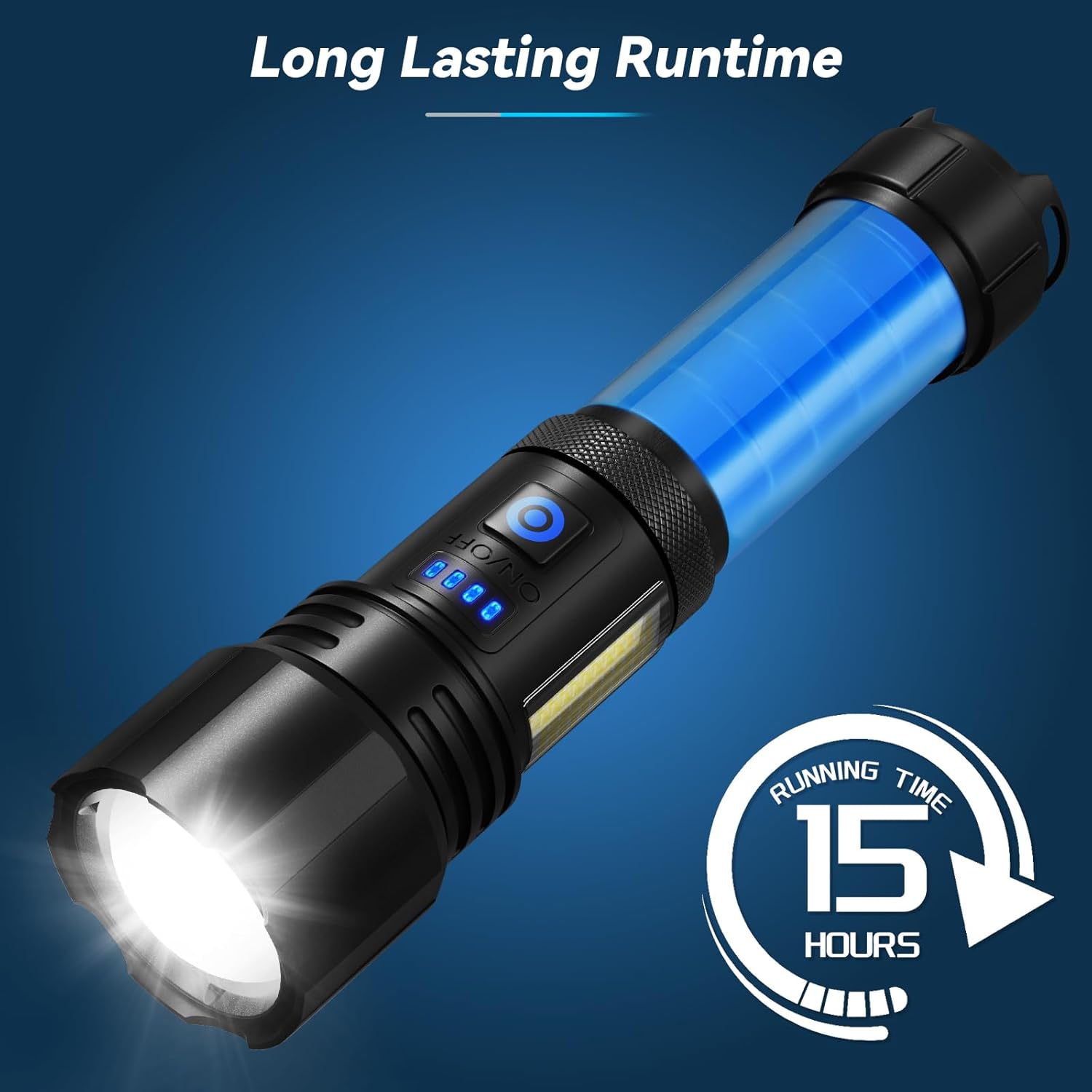 - USB RECHARGEABLE & POWER DISPLAY. Rechargeable flashlight equipped with large capacity rechargeable ΒATTERY, It can be continuously illuminated for 15 hours when fully charged. In addition, the led flashlight power display light lets you know the power status of the handheld flashlights in real time