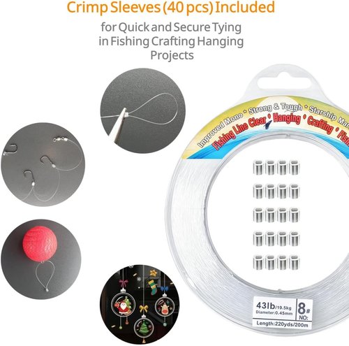 - 1.Strong & Invisible Thin FISHING LINE WIRE with Bonus Crimping Sleeves: 1650 ft (550 Yards) of clear thin fishing line with a 0.2mm diameter, designed for a wide range of fishing crafting hanging projects. With an approximate 10lb test break strength, this graded nylon string is thin yet durable, making it perfect for both indoor and outdoor use, including fishing for species like trout and crappie