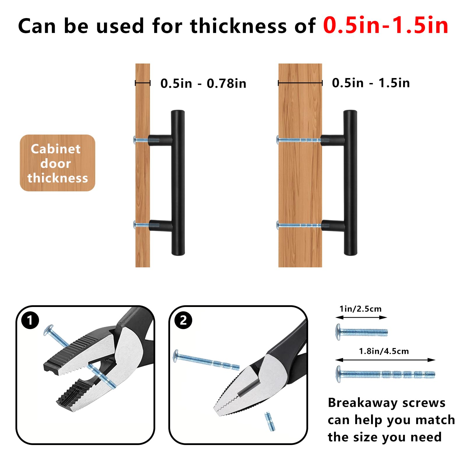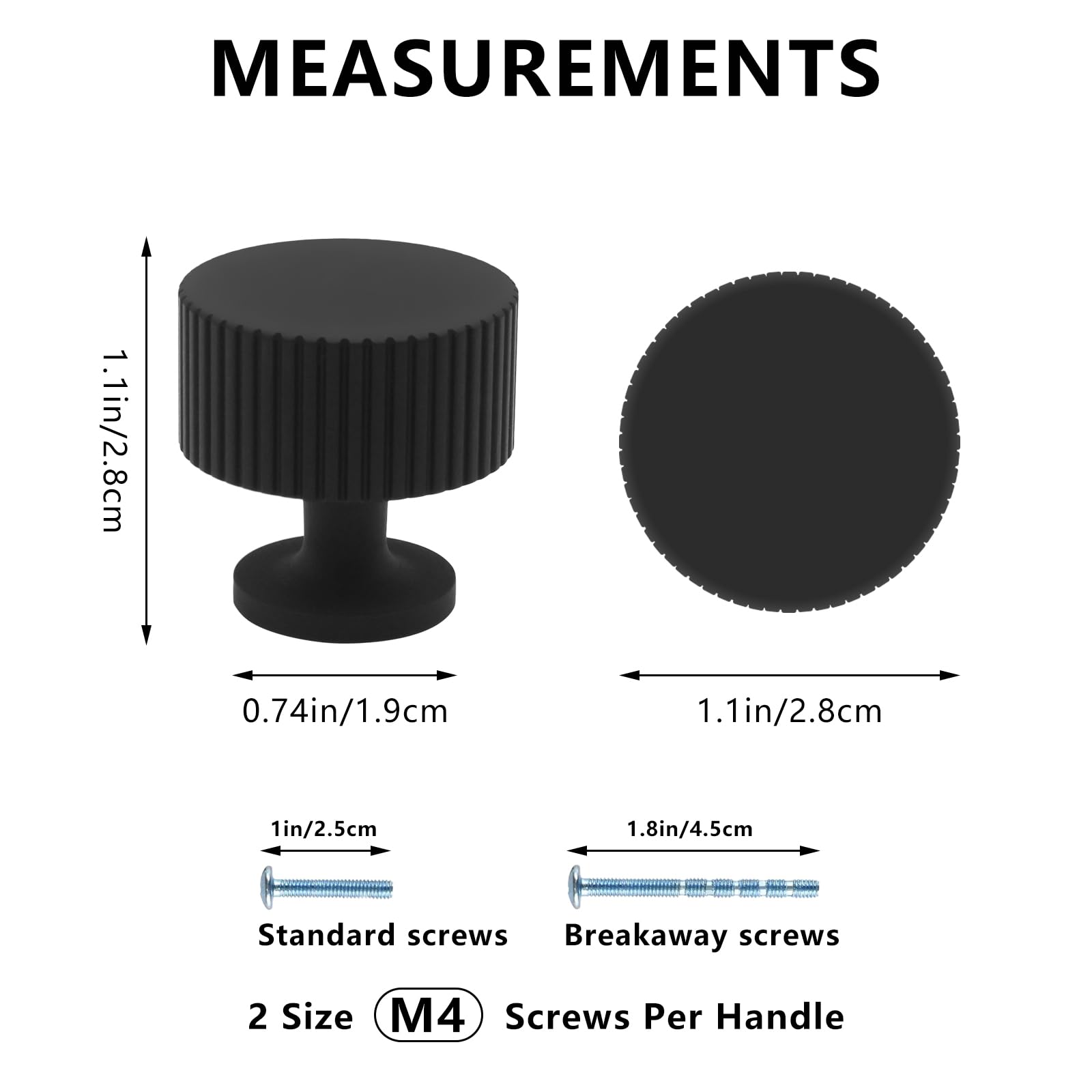 - 【What's in the Package】: Each package includes 4 cabinet knobs, 4 standard 1 inch screws, and 4 breakaway 1.8 inch screws. Each handle is individually wrapped and packaged to protect the beautiful color from scratches.