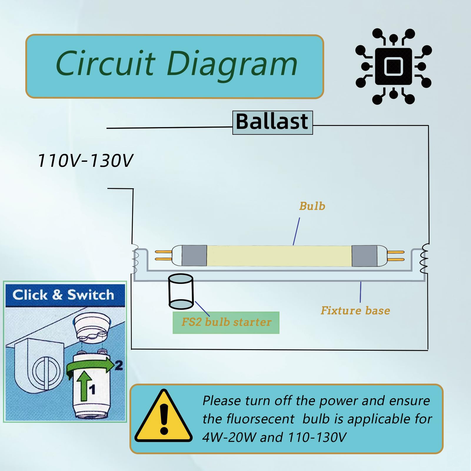 - FS-2 starter works 4-20Watts, F4,F6,F8,F14,F15 and F20W fluorescent light bulbs.