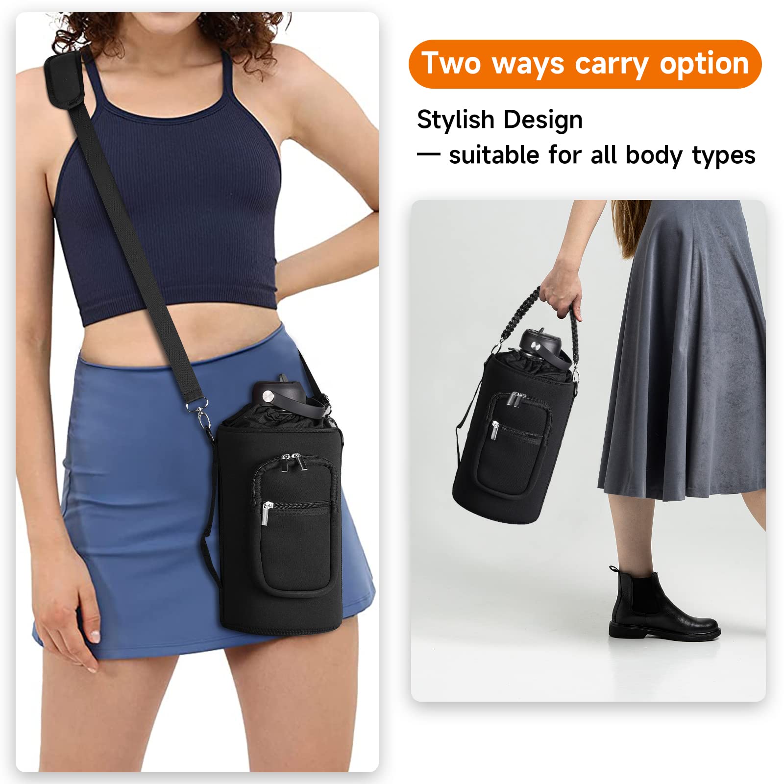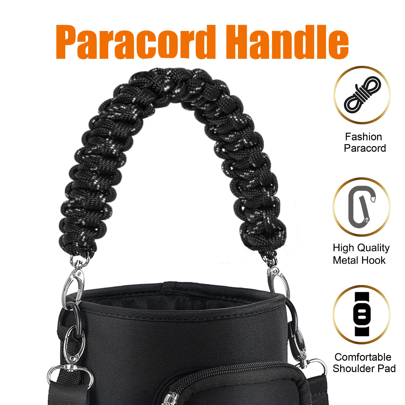 AceTreker 64 oz /87 oz/128 oz Neoprene Water Bottle Sleeve for Insulated Metal Water Jug Bottles, Carrier Sling Bag with Adjustable Shoulder Strap & Paracord Handle and 2 Pocket for Walking-Black