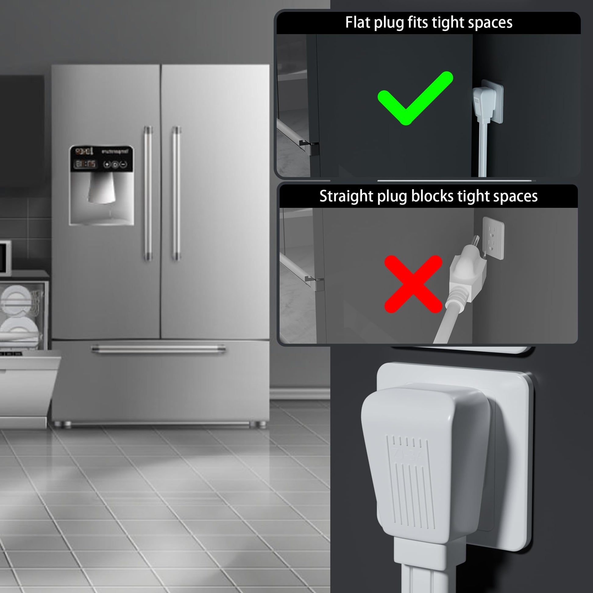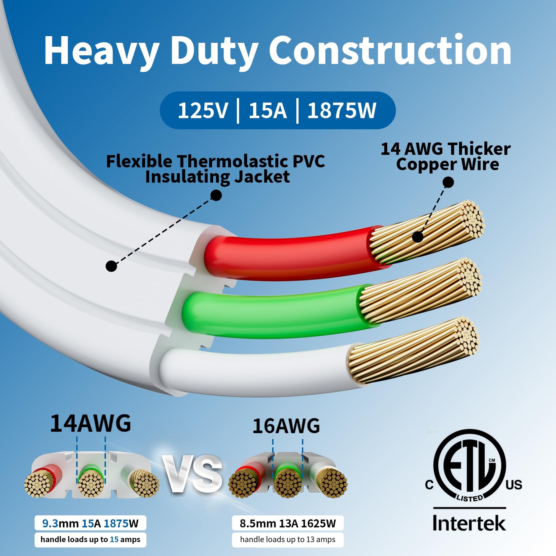 - Our Advantages: Built with heavy-duty 14 AWG thick wire gauge, sturdier and more durable than 16 AWG, capable of carrying high-power loads without overheating or leakage even during long-term use----Space-saving flat design: compact flat plug (widest point about 1.1 inch) sits flush against the wall at a 90-degree angle, while the flat cord easily passes through tight spaces behind furniture, bookcases, or desks, maximizing indoor space utilization----Stylish and minimal white jacket blends seamlessly with any environment----Available in multiple lengths from 3 to 30 feet to suit various needs, easily covering household appliances