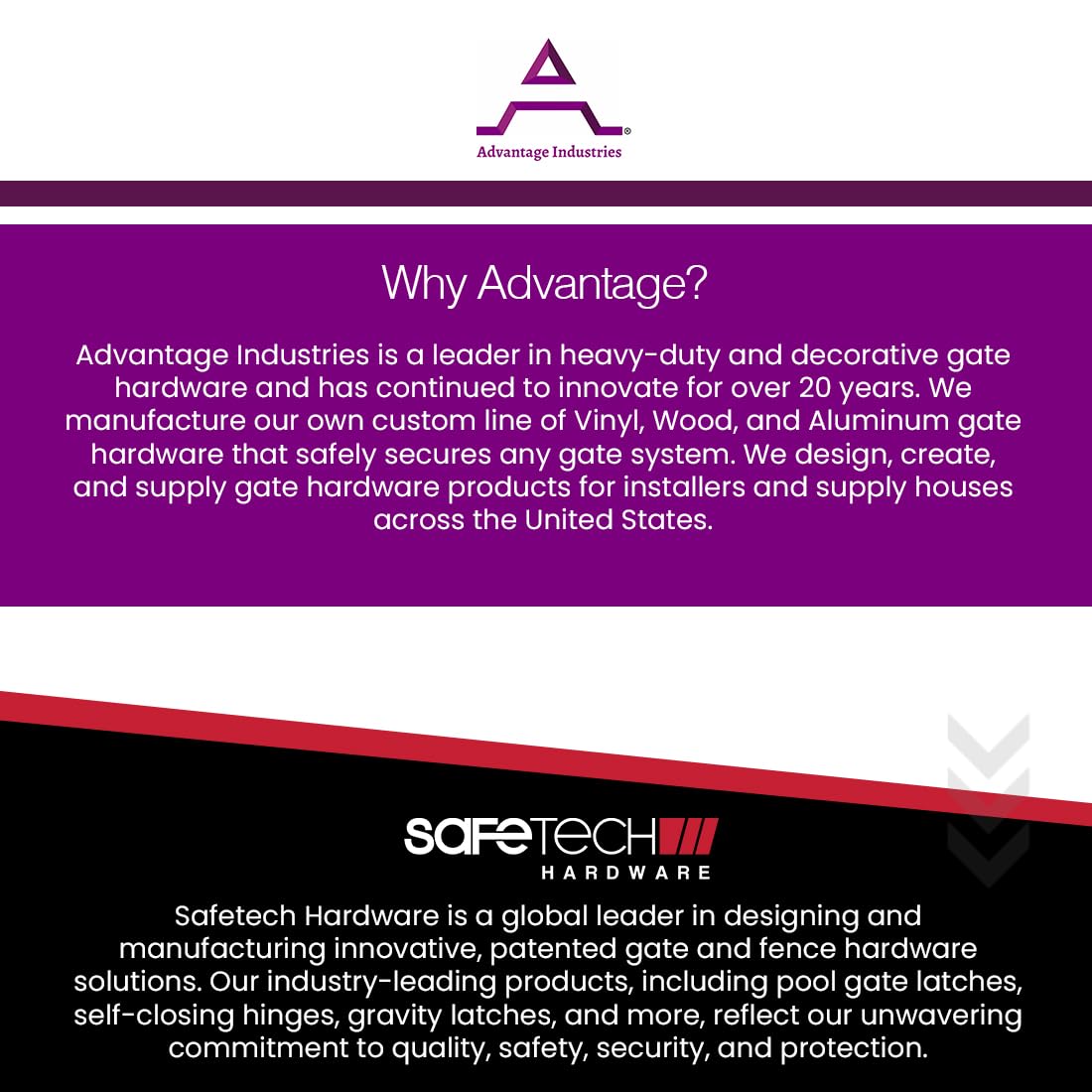 - 𝗧𝗵𝗲 𝗕𝗿𝗮𝗻𝗱 𝗖𝗼𝗻𝘁𝗿𝗮𝗰𝘁𝗼𝗿𝘀 𝗧𝗿𝘂𝘀𝘁: Advantage Industries is a leader in heavy-duty and decorative gate hardware and has continued to innovate for over 20 years. We manufacture our own custom line of Vinyl, Wood, and Aluminum gate hardware that safely secures any gate system. We design, create, and supply gate hardware products for installers and supply houses across the United States.