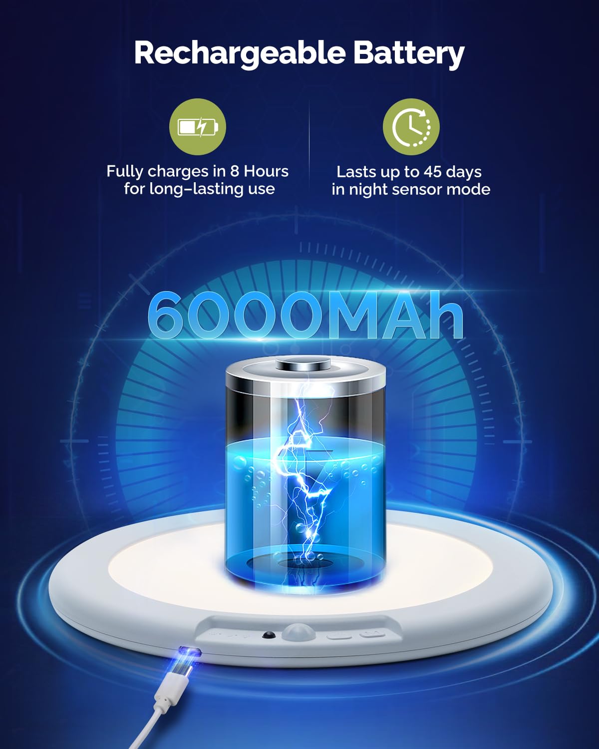 - Rechargeable Battery Shower Lights: No more buying batteries. This rechargeable ceiling light comes with a 6000mAh rechargeable battery. Easily recharge with the included USB cable and enjoy up to 45 days of use in night sensor mode after an 8-hour charge. It also serves as emergency lighting during power outages, ensuring continuous illumination when needed