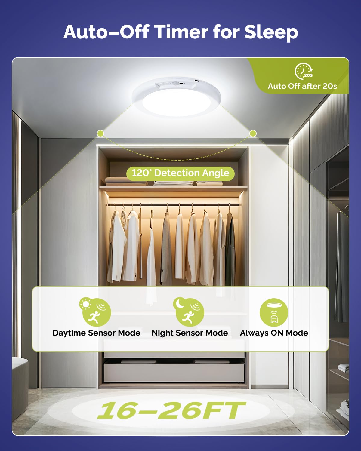 - Motion Sensor Light Indoor: Features ON Mode (light stays on continuously), Daytime Sensor Mode (activates only during the day and turns on when motion is detected), and Night Sensor Mode (activates only in low-light conditions and turns on when motion is detected) to meet different needs. The 120° sensor detects movement within 16-26 feet and turns off after 20 seconds of no motion, saving energy while providing convenience
