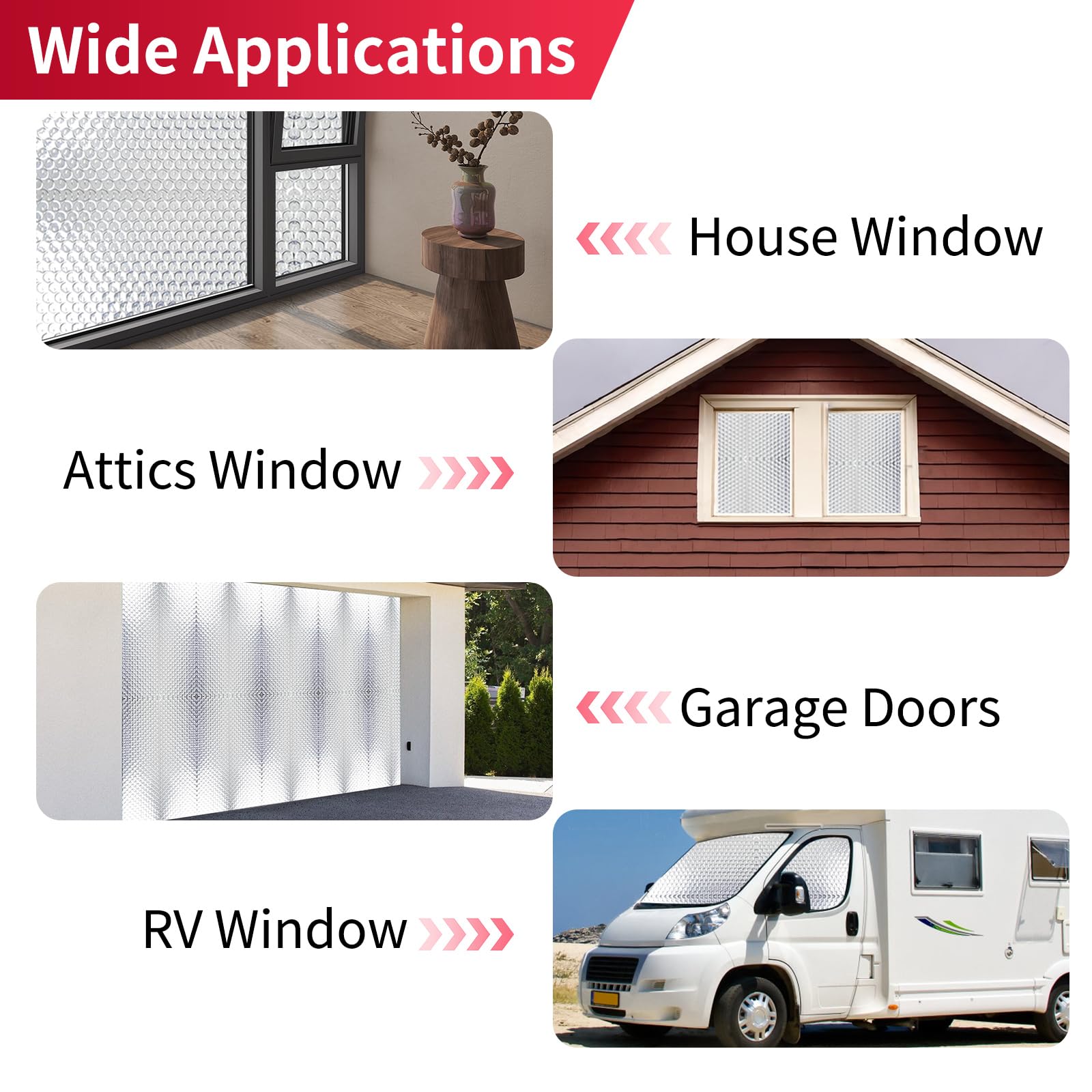 - [Wide Range of Applications] This aluminum foil bubble insulation foam can be used in a variety of places to block UV rays, including window heat blocker, RV door window shade, RV vent insulator, roof insulation, garage door screen, attic spaces,attic flooring, etc. to act as a heat foil insulation thermal barrier.
