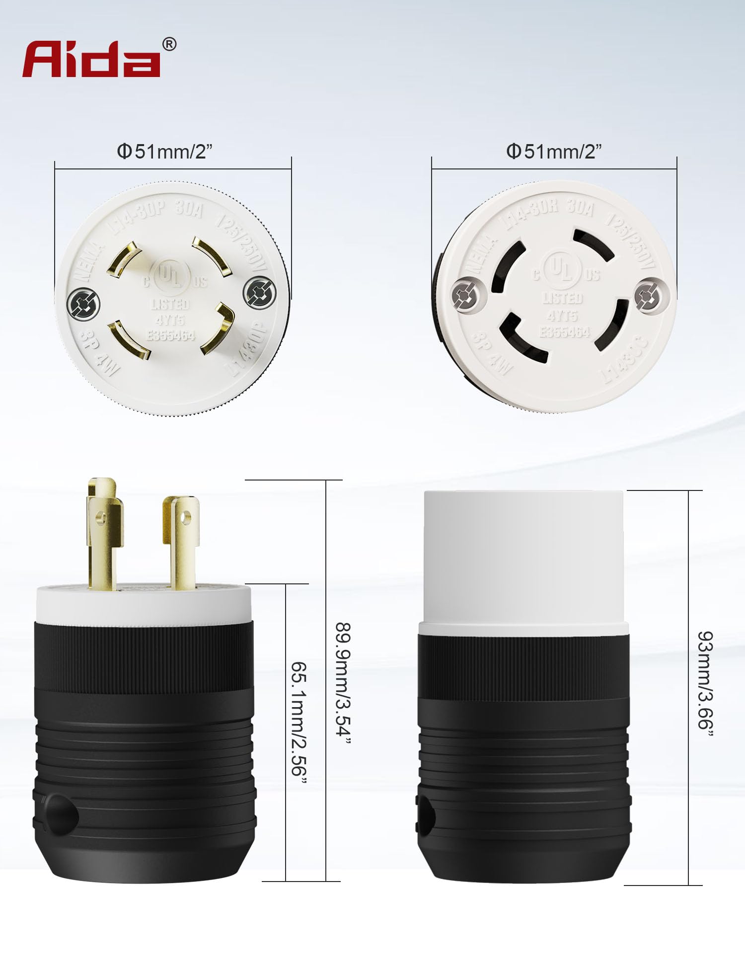 AIDA NEMA L14-30P & NEMA L14-30R Locking Plug and Connector, Twist Generator Male and Female Adapter, 30 Amp, 125/250 Volt, 3-Pole 4-Wire Grounding, Industrial-Strength Heavy Duty, UL Listed