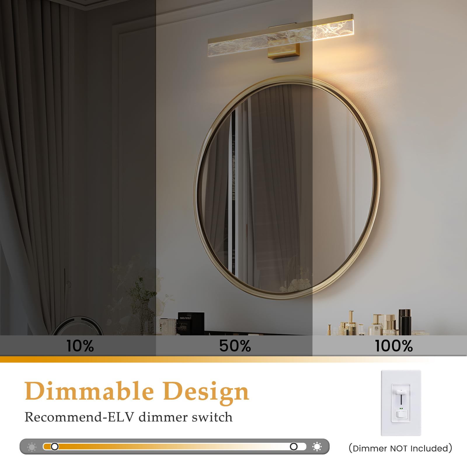 - DIMMABLE & ENERGY SAVING: AIJIASI bathroom lights over mirror feature LED dimmable technology and are compatible with most LED-ELV dimmers (dimmers not included). Premium LED beads make sure that lifespan is up to 50,000 hours. LED technology saves up to 80% electricity compared to conventional light bulbs.