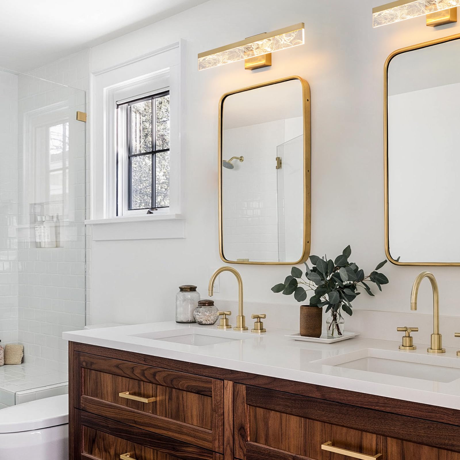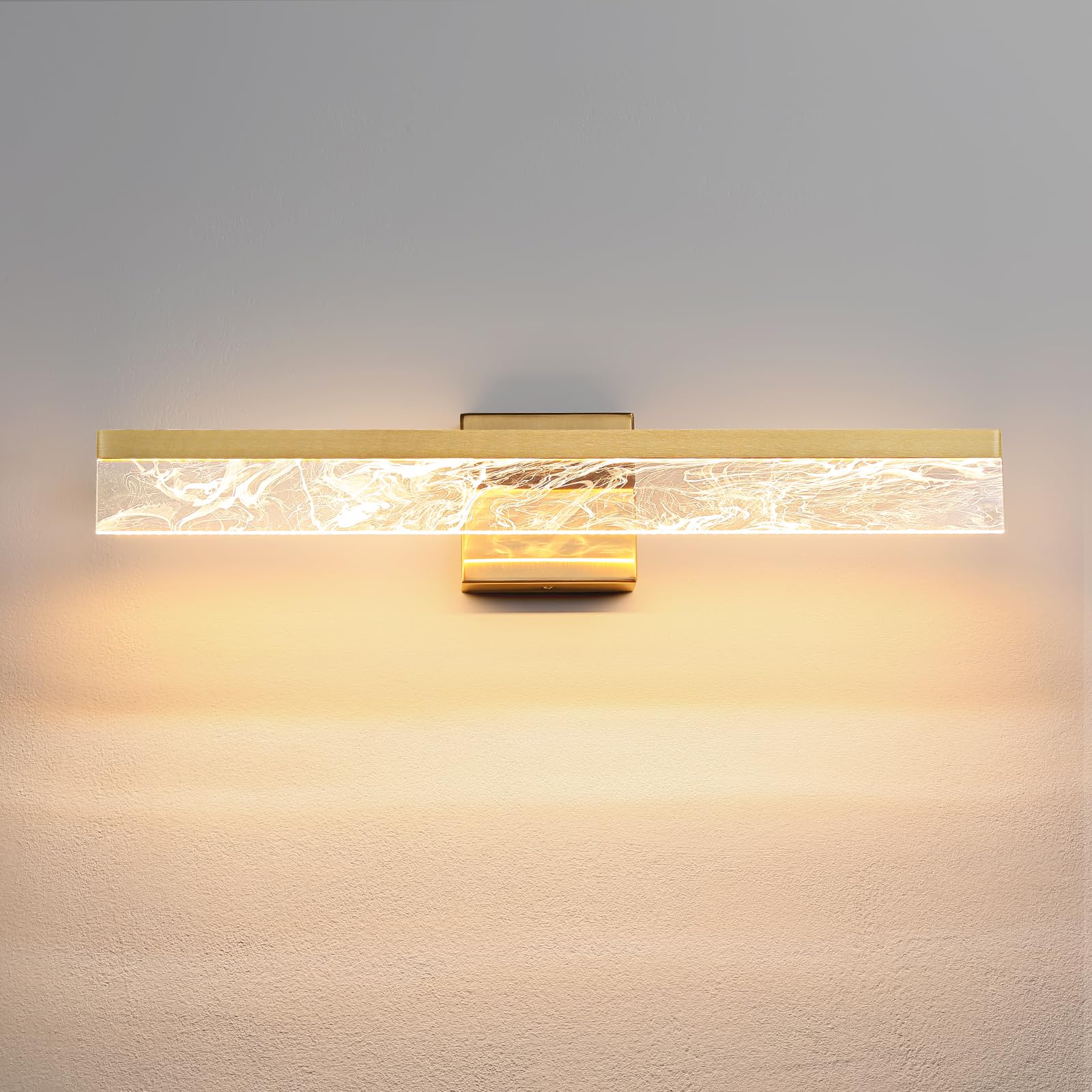 - MODERN ELEGANT DESIGN: This gold bathroom light fixture is made of high-quality metal back panel and acrylic, the unique smoke design, brings a contemporary touch to your space. Perfect for bathroom lighting, it can be installed above your mirror or vanity, adding an elegant glow to your decor.