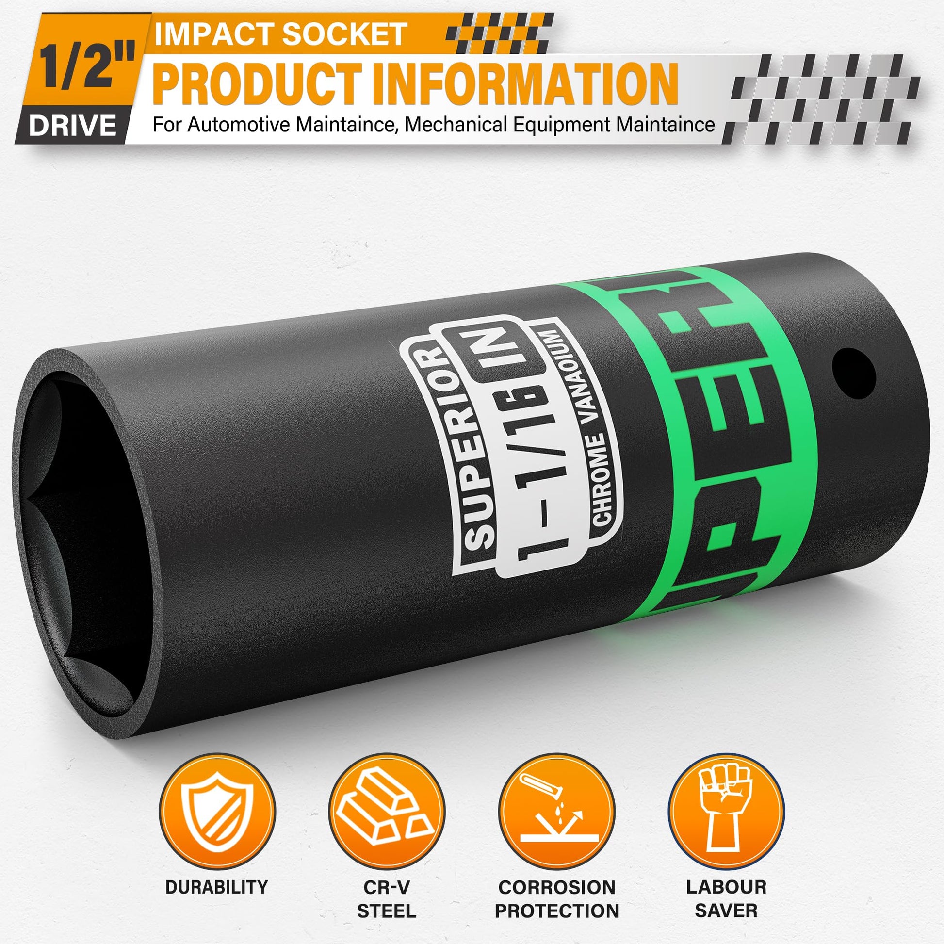Aiourx 1/2" Drive Impact Socket, 1-1/16 inch Deep Socket, SAE, 6 Point, CR-V, for Car Repair, Loosen the Fastening Nut