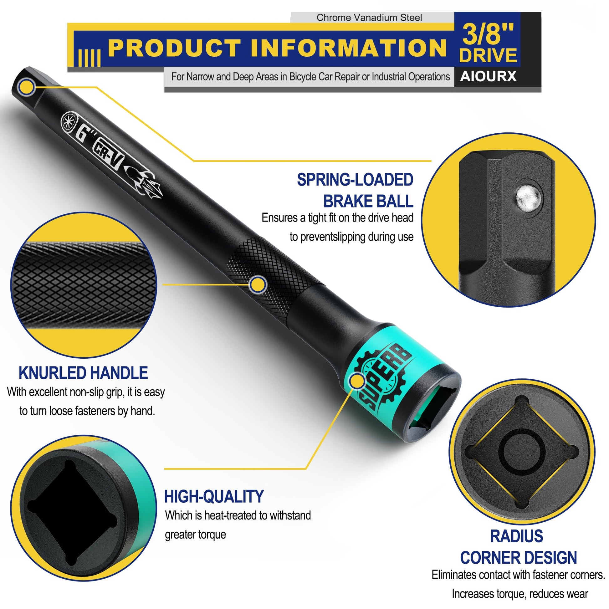 Aiourx 3/8" Drive Impact Extension Bar Set, 3 Pcs Socket Extensions Sets, 3" 6" 10" Length, CR-V Steel, Narrow and Deep Areas in Bicycle, Car Repair or Industrial Operations