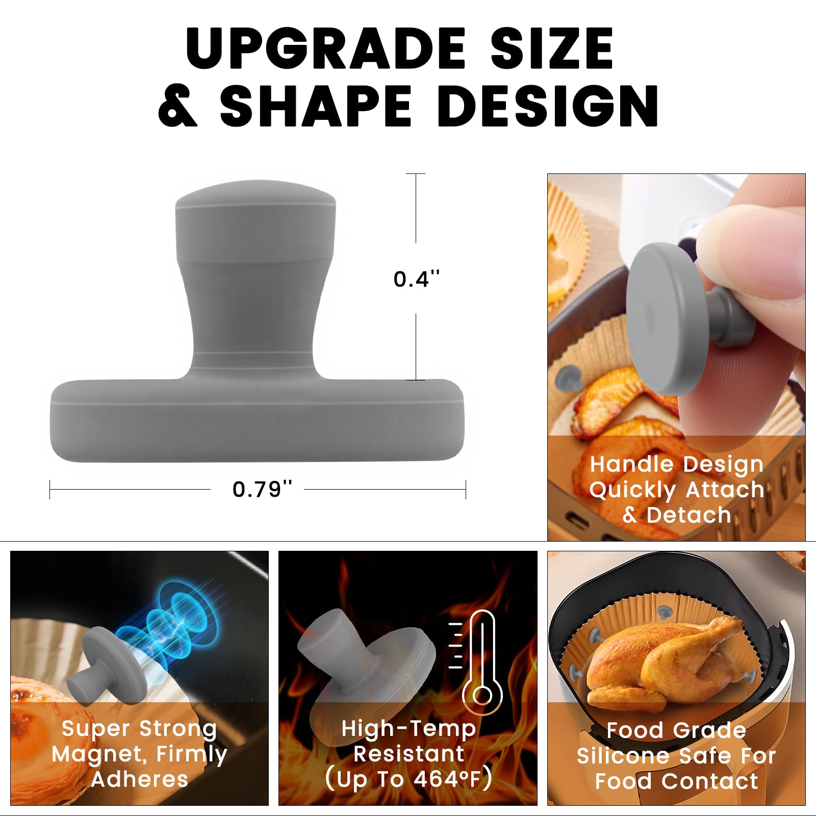 - 【Quickly Installation & Release】Handle design makes operation simpler enables one-second installation and removal. Simply grip the handle, align it with the edge of air fryer & parchment paper, and the strong magnet instantly secures the disposable air fryer liners.