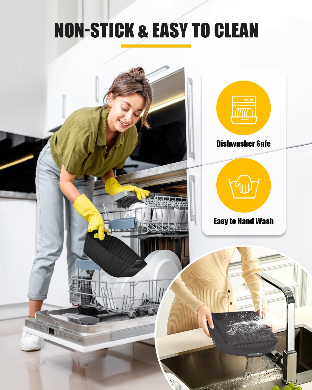 - Easy to Clean & Dishwasher Safe - Keep your air fryer clean and enjoy delicious foods. Unique pattern design makes residue oil easily flow out when cleaning. The soft and flexible silicone bottom can be inverted for thorough cleaning, simplifying maintenance tasks. Handwash with warm water, dishwasher safe.