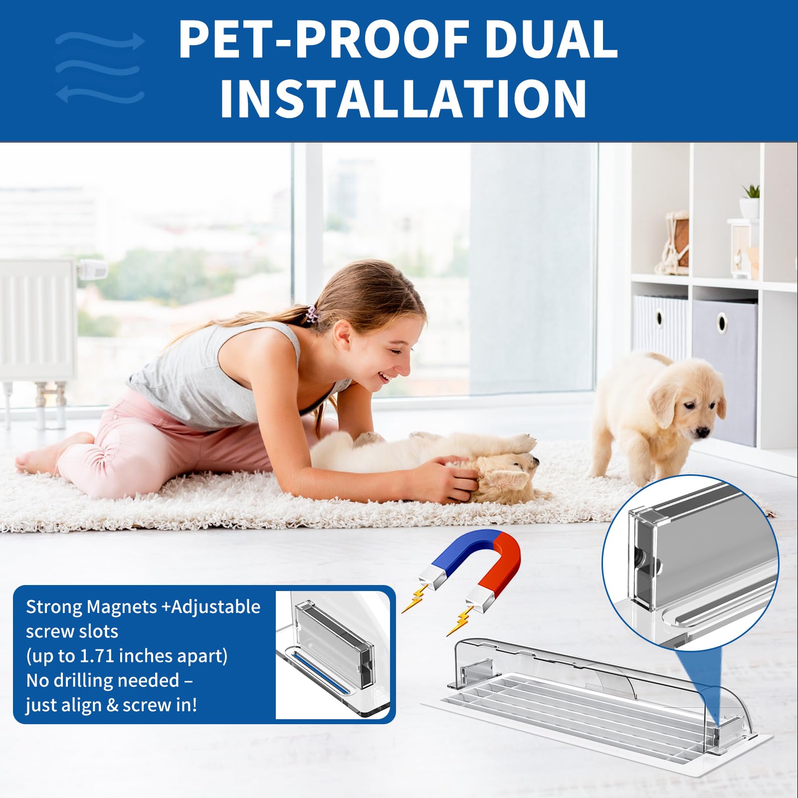 - 【HIGH QUALITY MATERIAL】Our vent deflectors for home floor are made of high-density and heat-resistant pc material, which is transparent like glass and does not affect the beauty of the home. the high-performance magnet design at both ends is sturdy, durable, and easy to install and remove