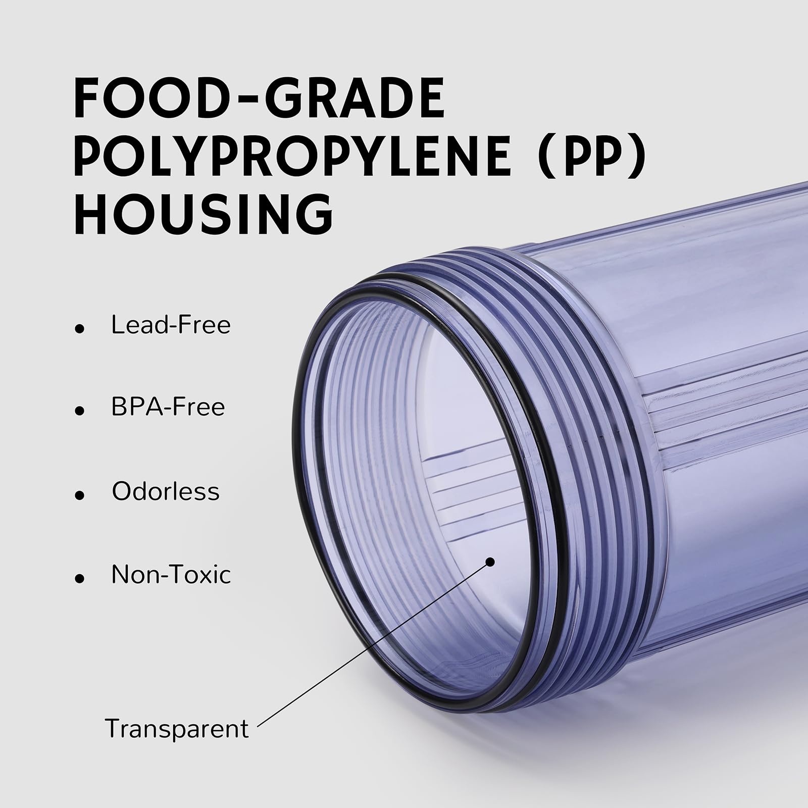 - Premium Construction: Crafted with premium quality to meet NSF standards, reinforced polypropylene housing ensures strength and chemical resistance to provide you with safe and healthy filtered water.