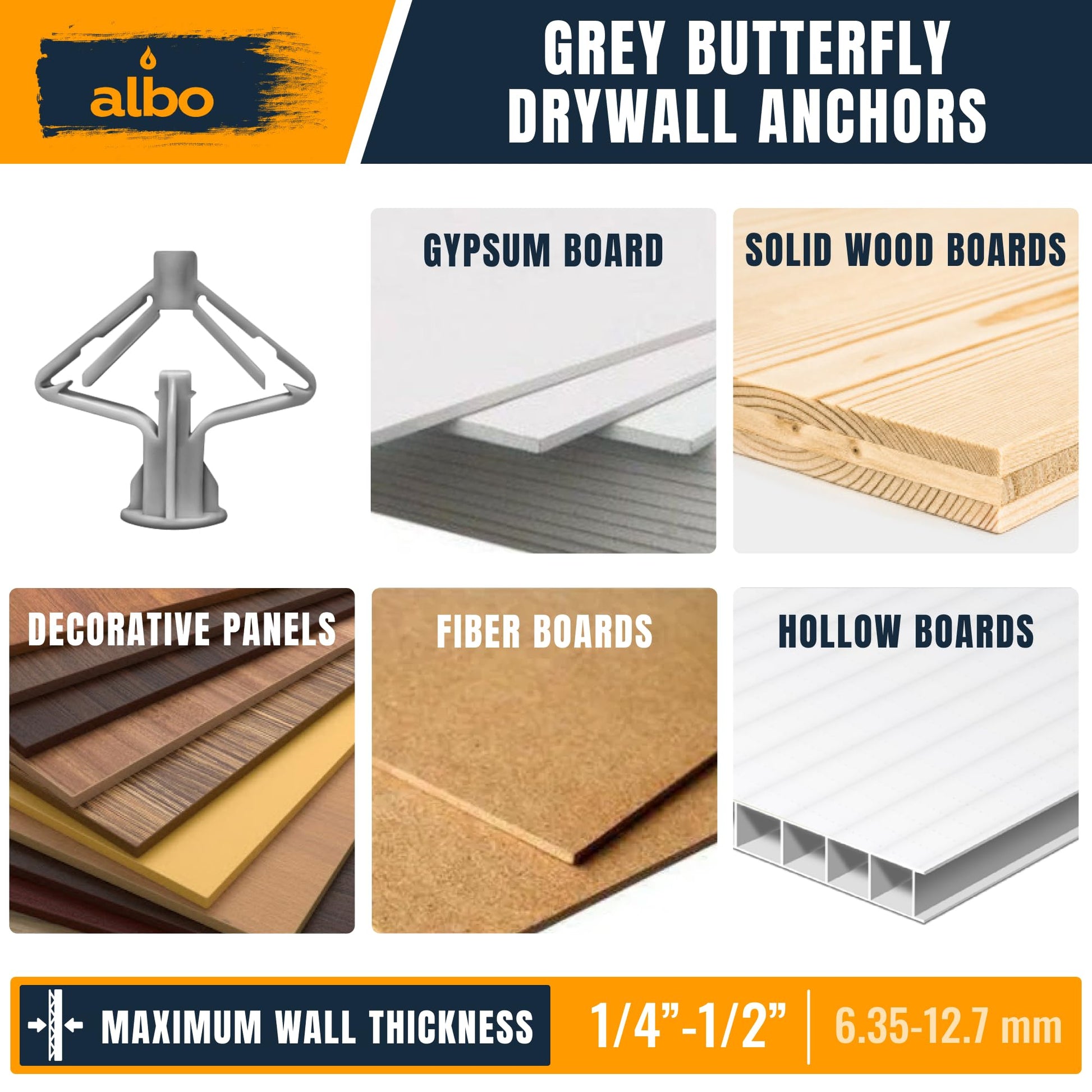 ALBO Drywall Anchor Kit Hollow Wall with Screws 50 pcs. (Grey Anchor 25pcs + Screws 25pcs) Plastic Hollow Wall Drilling Anchors