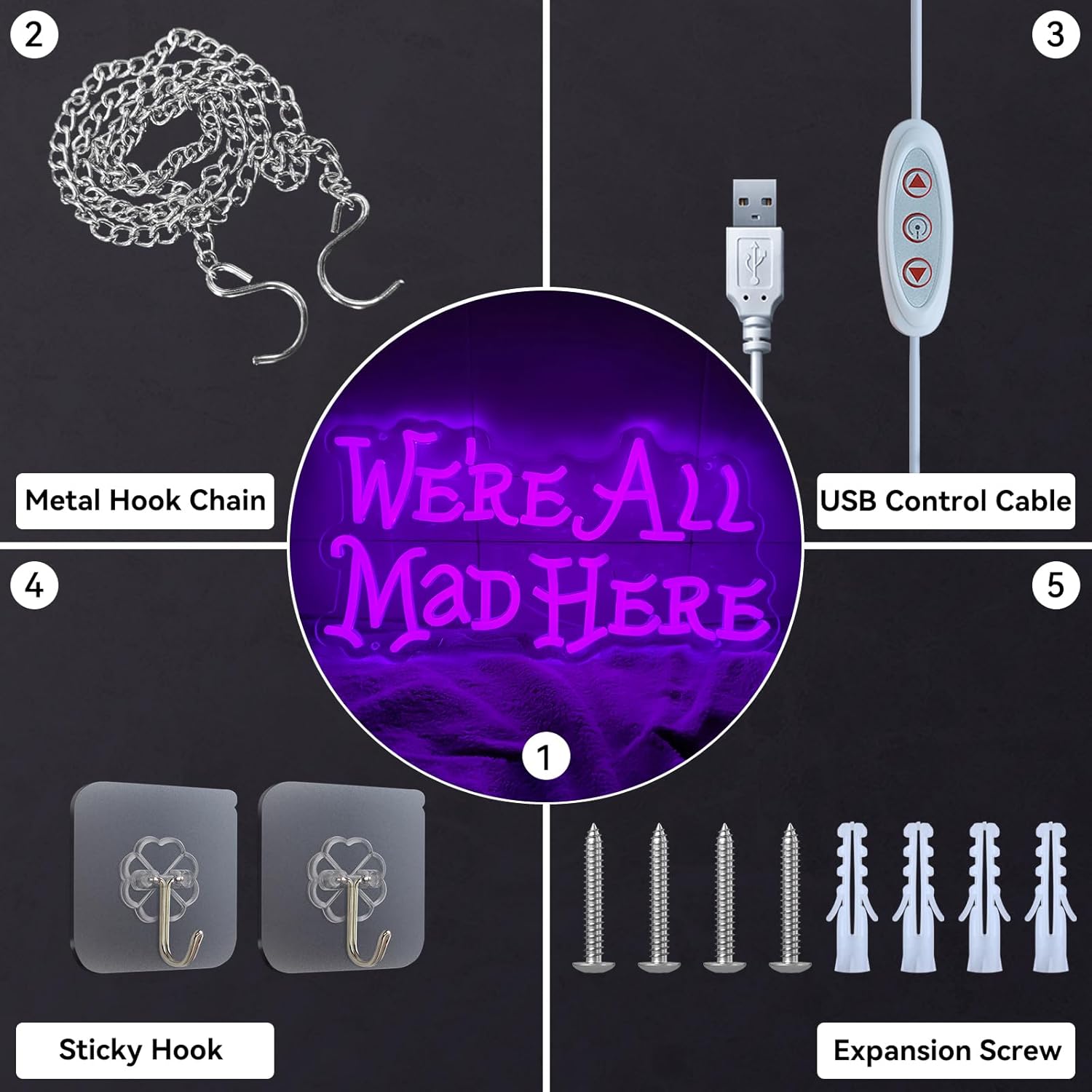 - Alice in Wonderland Decor Neon Sign Size & Package: The size of neon signs for wall decor is: 16x8 inch(40*21cm). The package include:1*we're all mad here neon lights, 1*hanging chain, 2*screw,2*sticky hook