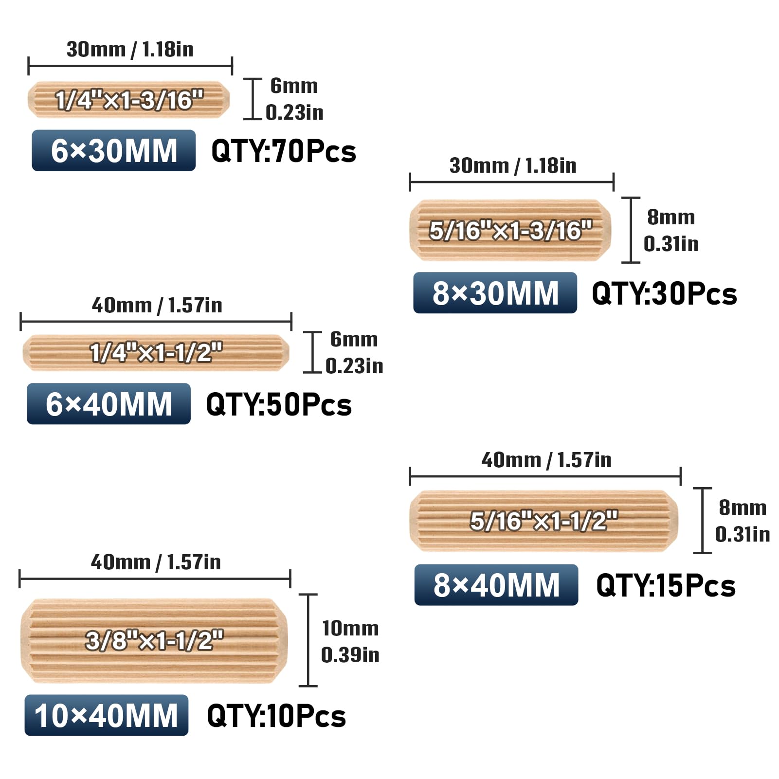 - ALLECIN Fluted Wood Dowel Pins Set - Includes 1/4 x 1-3/16Inch & 1/4 x 1-1/2Inch & 5/16 x 1-3/16Inch & 5/16 x 1-1/2Inch & 3/8 x 1-1/2Inch.