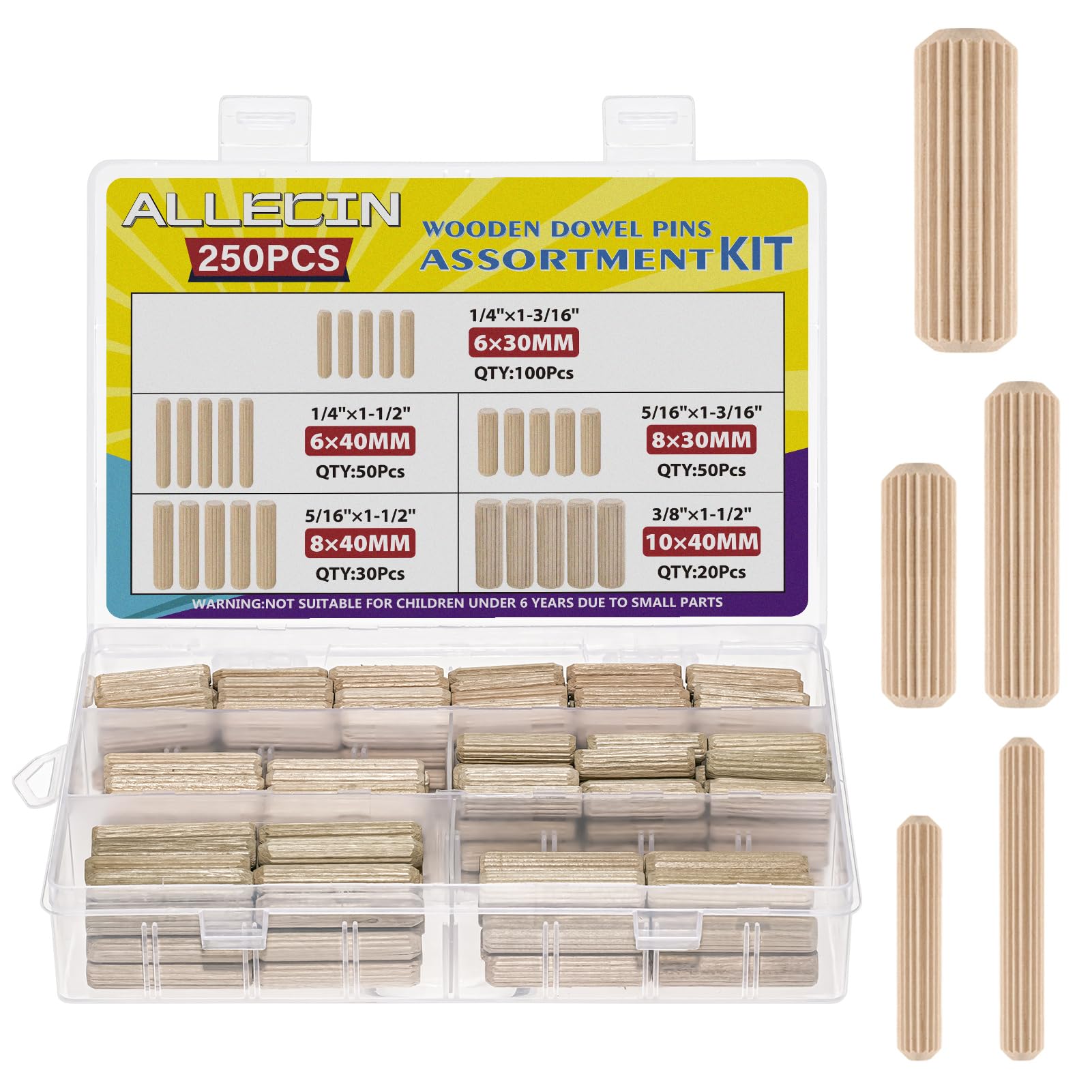 ALLECIN 5 Sizes 250Pcs Wooden Dowel Pins Kit 1/4 3/8 5/16 Inch Small Fluted Wood Dowels Pegs Hardwood Pin for Furniture Woodworking Crafts