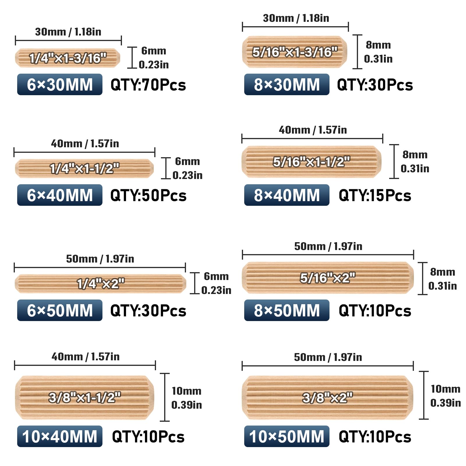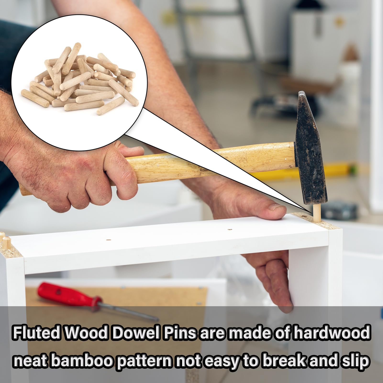 - ALLECIN Fluted Wooden Dowel Set - Includes 1/4 x 1-3/16Inch & 1/4 x 1-1/2Inch & 1/4 x 2Inch & 5/16 x 1-3/16Inch & 5/16 x 1-1/2Inch & 5/16 x 2Inch & 3/8 x 1-1/2Inch & 3/8 x 2Inch.