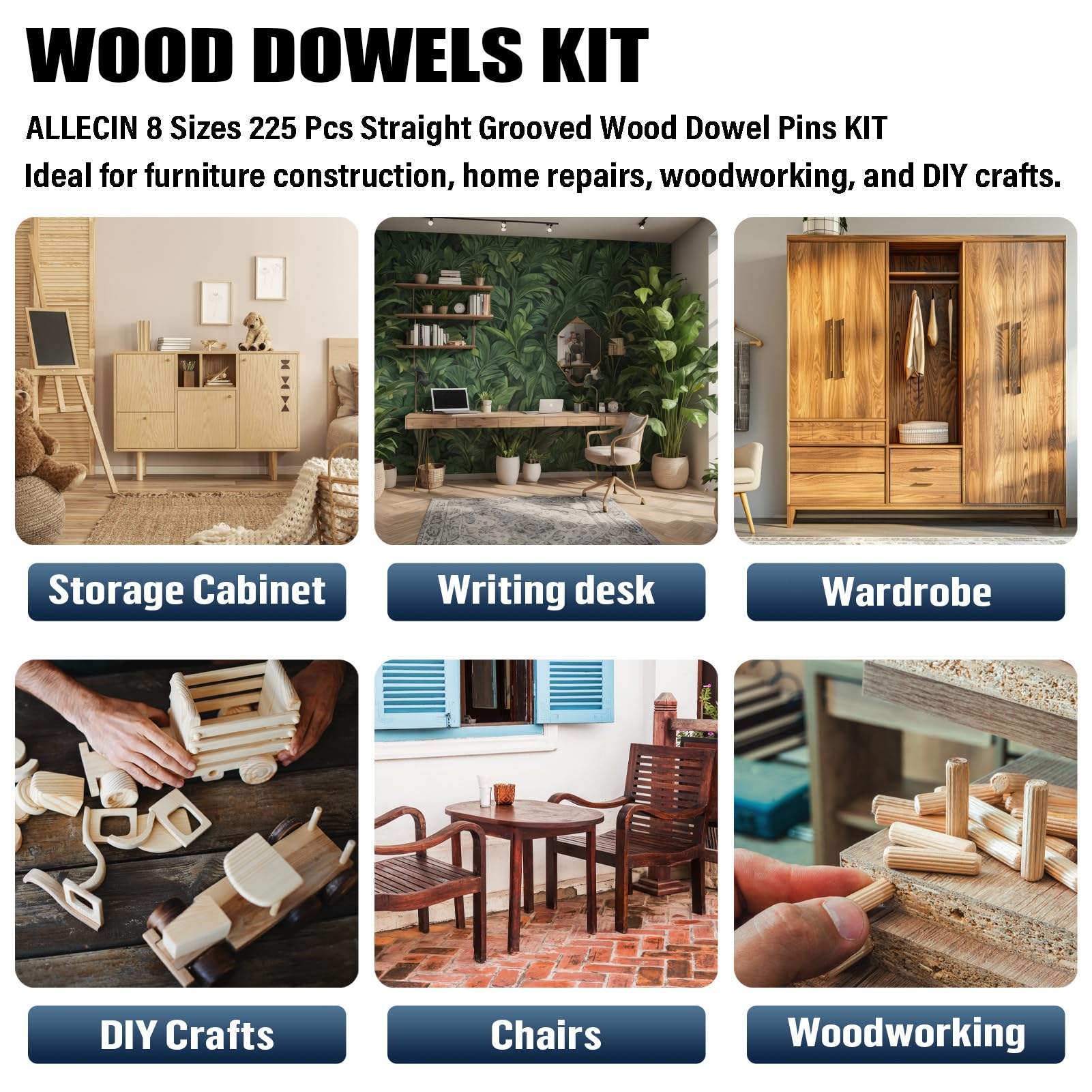 ALLECIN 8 Values Wood Dowels Kit 1/4 3/8 5/16 Inch Fluted Wooden Dowel Pins Pegs Assortment for Furniture Woodworking DIY Crafts (Pack of 225Pcs)