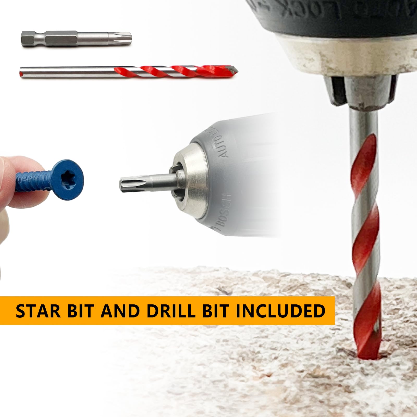 - [Satisfaction Guarantee]: You will get a box of 100pcs concrete screws, a T25 Star Bit and a adaptable drill bit. Please contact us with any questions or issues that you may have