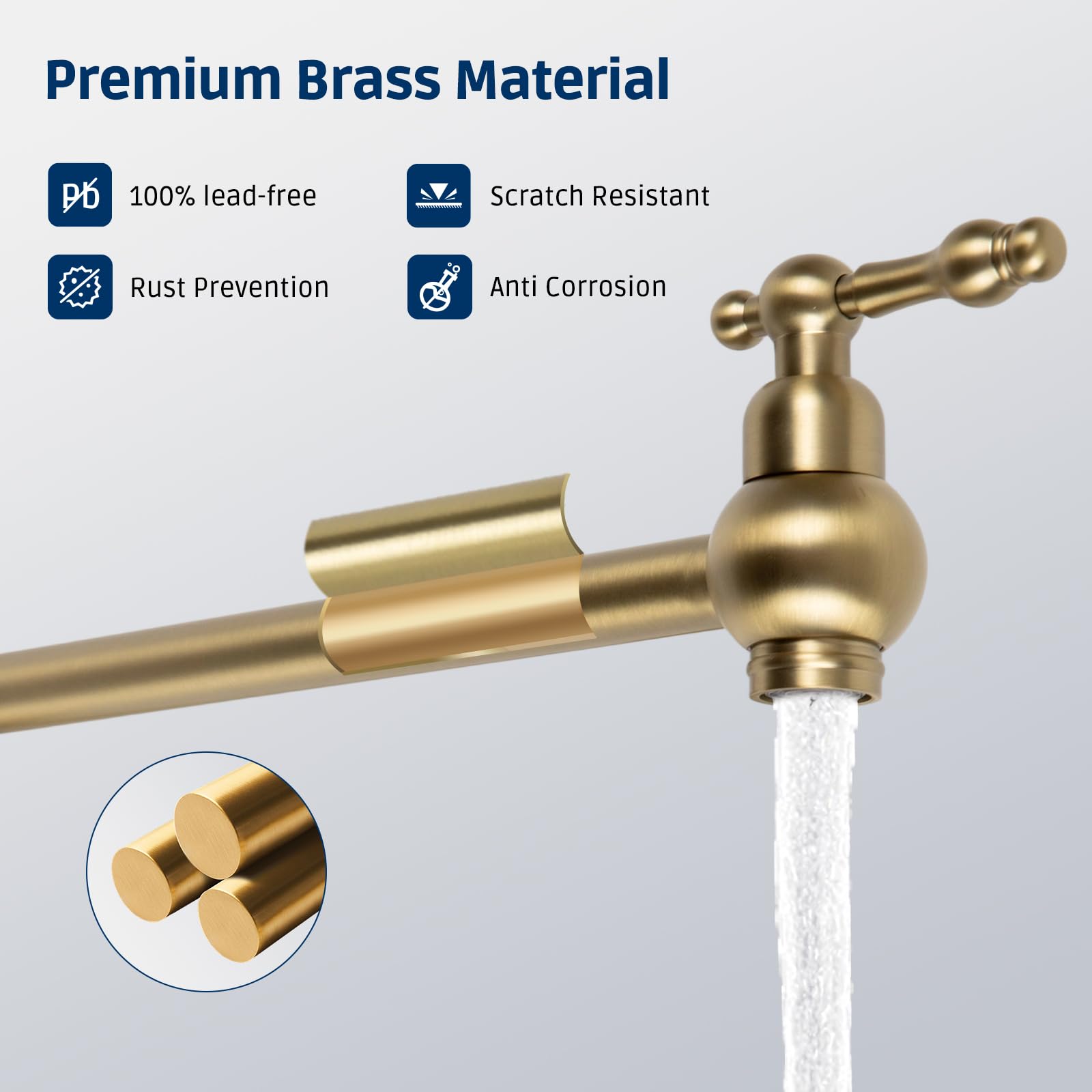 - Premium Material: The main material of the brushed gold pot filler is brass, showcasing the luxurious texture of the pot filler faucet and extending its service life.