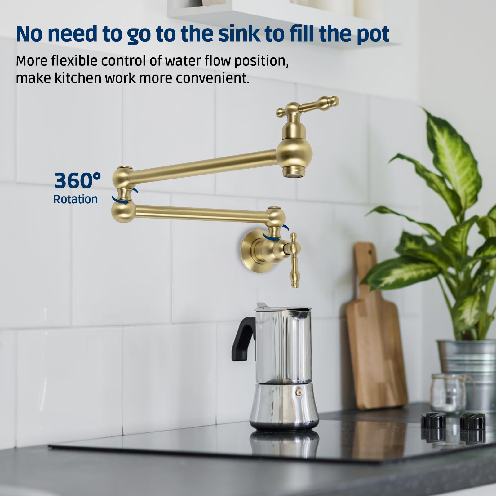 - Dual-handle Design: The brushed gold pot filler faucet with 2 handles is equipped with 360°rotating dual joints, which makes it more convenient to control the position and speed of the water flow, making it very suitable for cooking. When not in use, the pot filler can be folded up, which is also space-saving.
