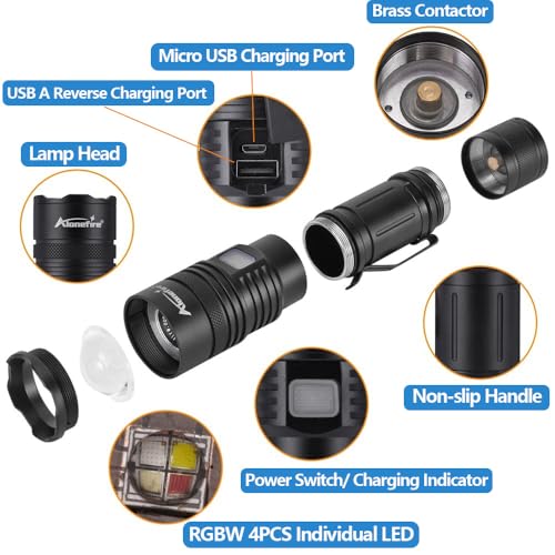ALONEFIRE X37 Multicolor LED Flashlight 4 Color Change White Blue Green Red Light RGB USB Rechargeable Zoom Waterproof with Reverse Charging, Rechargeable Battery for Tracking Deer Hunting Fishing