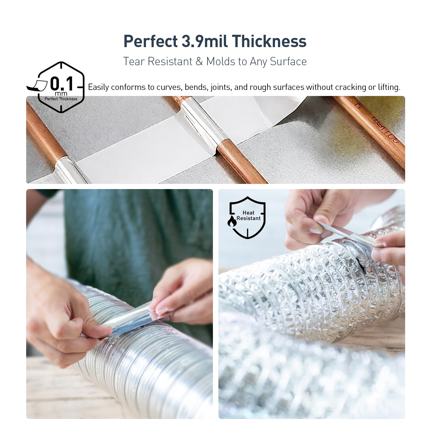 - PERFECT THICKNESS FOR STRENGTH AND FLEXIBILITY: Built with a well balanced 3.9mil (0.1mm) aluminum foil layer, this tape offers superior tear resistance without being too stiff to mold. Easily conforms to curved, rough, or uneven surfaces like ductwork, pipe bends, or vents. It ensures a long lasting, tight seal without cracking, lifting, or wrinkling. A reliable choice for HVAC projects, insulation work, and surface repairs on metal, plastic, or other materials where durability matters.